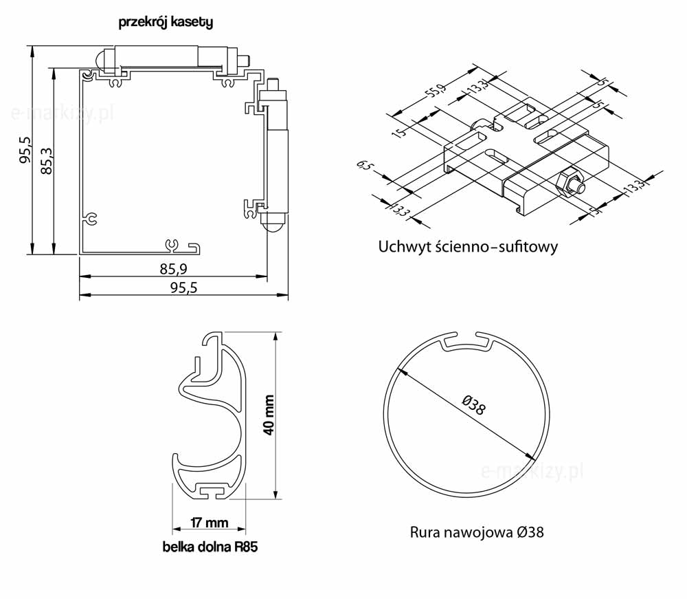 Refleksol 85-SA produkowany jest na wymiar. Maksymalna szerokość to 220cm a wysokość to 250cm. Do zamówienia lub wyceny podajemy zawsze całkowity zewnętrzny wymiar osłony, łącznie z kasetą.
