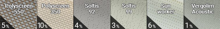 Szeroki wachlarz tkanin, pozwala na dopasowanie koloru rolety do architektury budynku oraz dobór odpowiedniego współczynnika przenikania promieni słonecznych. System wyposażony został w system naciągu tkaniny, który utrzymuje jej napięcie nawet na dużych powierzchniach. Tkaniny akrylowe to kolekcja stosowana głównie w markizach, tkaniny typu Screen są połączeniem PCV i poliestru, zależnie od wybranej grupy posiadają inne właściwości takie jak przepuszczalność światła czy dźwięku.
