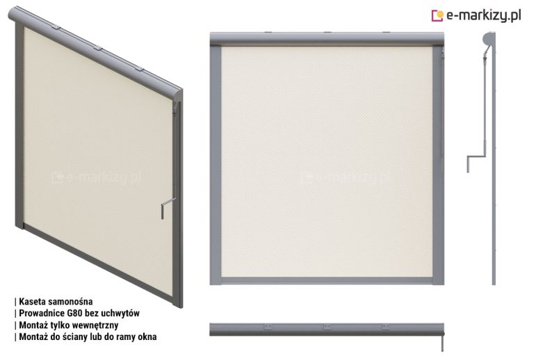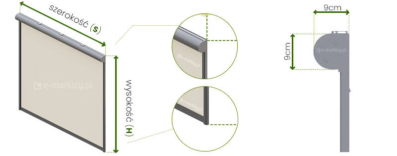 Refleksol 90 produkowany jest na wymiar. Przy prowadnicach linkowych maksymalna szerokość to 300cm a wysokość to 300cm, przy montażu na prowadnicach listwowych maksymalna szerokość to 300cm a wysokość to 400cm. Do zamówienia lub wyceny podajemy zawsze całkowity zewnętrzny wymiar osłony, łącznie z kasetą.