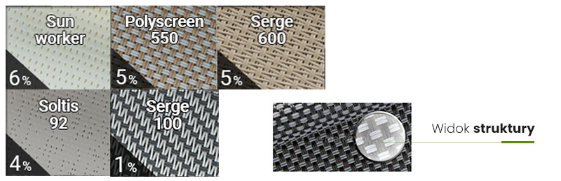 Szeroki wachlarz tkanin, pozwala na dopasowanie koloru rolety do architektury budynku oraz dobór odpowiedniego współczynnika przenikania promieni słonecznych. System wyposażony został w system naciągu tkaniny, który utrzymuje jej napięcie nawet na dużych powierzchniach. Tkaniny akrylowe to kolekcja stosowana głównie w markizach, tkaniny typu Screen są połączeniem PCV i poliestru, zależnie od wybranej grupy posiadają inne właściwości takie jak przepuszczalność światła czy dźwięku.