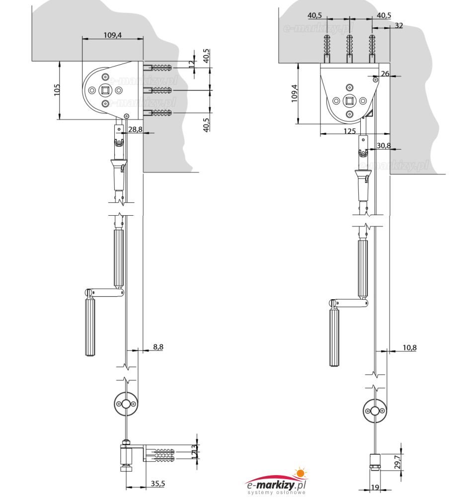 Standardowo refleksol xl wyposażony jest w napęd ręczny, sterowany korbą. Przekładnia oraz korba składana z anodowanego aluminium o standardowej długości 180cm z przegubem Cardana.