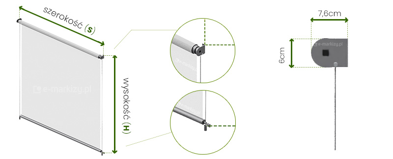 Refleksol XS produkowany jest na wymiar. Maksymalna szerokość to 260cm a wysokość to 260cm. Do zamówienia lub wyceny podajemy zawsze całkowity zewnętrzny wymiar osłony, łącznie z kasetą.