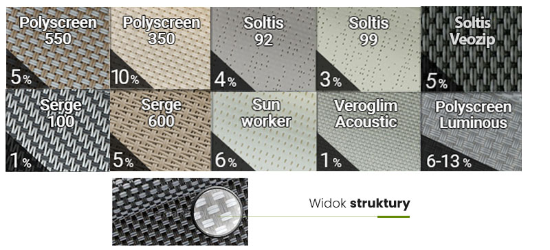 Szeroki wachlarz tkanin, pozwala na dopasowanie koloru rolety do architektury budynku oraz dobór odpowiedniego współczynnika przenikania promieni słonecznych. System wyposażony został w system naciągu tkaniny, który utrzymuje jej napięcie nawet na dużych powierzchniach. Tkaniny akrylowe to kolekcja stosowana głównie w markizach, tkaniny typu Screen są połączeniem PCV i poliestru, zależnie od wybranej grupy posiadają inne właściwości takie jak przepuszczalność światła czy dźwięku.