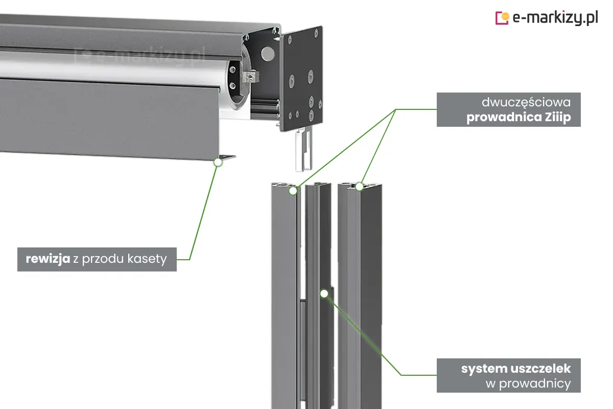 Refleksol 95 Ziiip to system kasetowy automatyczny. Kaseta wykonana z ekstrudowanego aluminium do montażu wnękowego lub ściennego. Dwuczęściowa prowadnica z systemem uszczelek kompensujących Refleksol wnękowy ziiip dzięki rozbudowanemu systemowi uszczelek kompensujących umożliwia pełne zaciemnienie nawet przy dużych nierównościach na elewacji budynku. Jest to jedyne rozwiązanie tego typu do stosowania na zewnątrz. Refleksol standardowo wyposażony jest w sterowanie elektryczne.