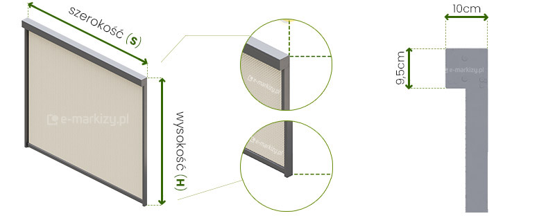 Refleksol Ziiip 95 produkowany jest na wymiar. Maksymalna szerokość to 270cm a wysokość to 300cm. Do zamówienia lub wyceny podajemy zawsze całkowity zewnętrzny wymiar osłony, łącznie z kasetą.