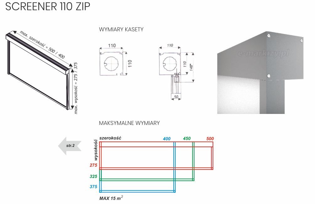 Refleksol Zip do pergoli produkowany jest na wymiar. Maksymalna szerokość to 500cm a wysokość to 285cm, przy montażu na prowadnicach listwowych maksymalna szerokość to 300cm a wysokość to 285cm. Do zamówienia lub wyceny podajemy zawsze całkowity zewnętrzny wymiar osłony, łącznie z kasetą.