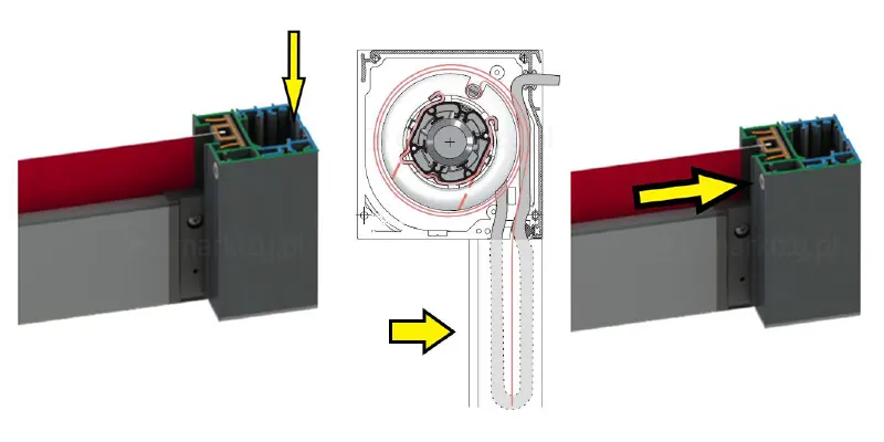 - W profilu zewnętrznym prowadnicy (5) wykonaj otwory w zależności od kierunku mocowania (doczołowo/rozporowo) – częstotliwość otworów pokazuje schemat. Stosuj łączniki montażowe w podanej klasie (dla podłoża aluminiowego).