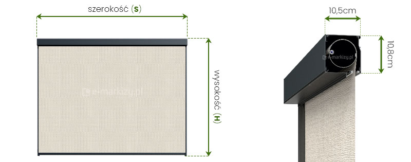Refleksol Zip w kasecie produkowany jest na wymiar. Maksymalna szerokość to 500cm a wysokość to 300cm. Do zamówienia lub wyceny podajemy zawsze całkowity zewnętrzny wymiar osłony, łącznie z kasetą.