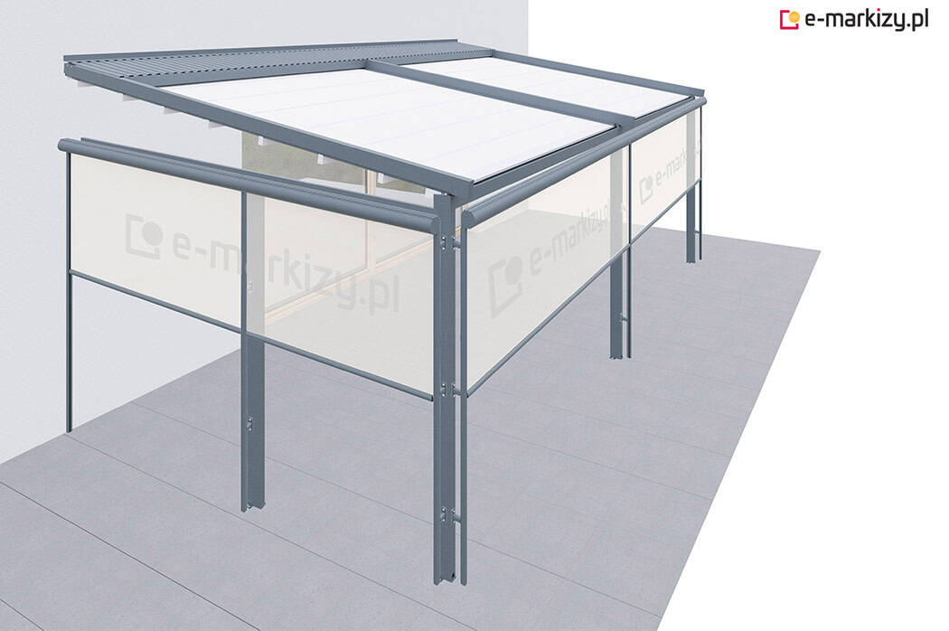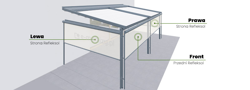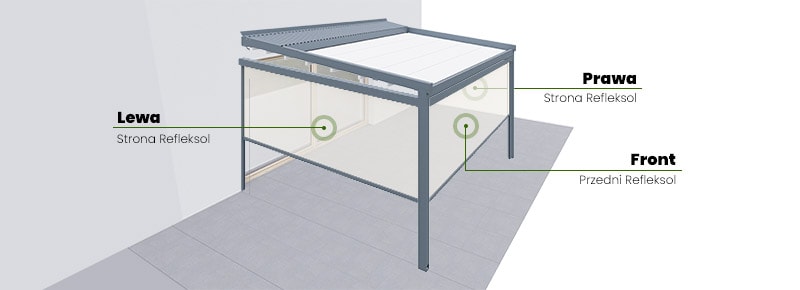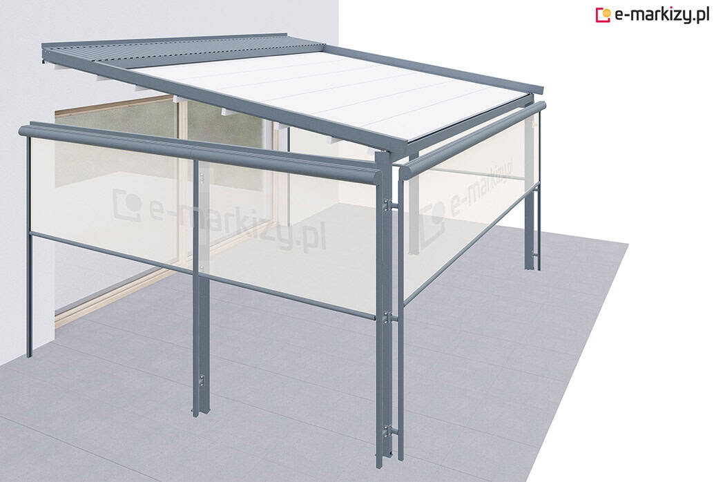 Roleta refleksol typu screen zapewnia osłonę przed wiatrem od frontu, a także z prawej i lewej strony tarasu. Osłona mocowana jest na prowadnicach aluminiowych od zewnątrz konstrukcji pergoli. Sterowanie osłoną boczną odbywa się za pomocą dedykowanego pilota bezprzewodowego.