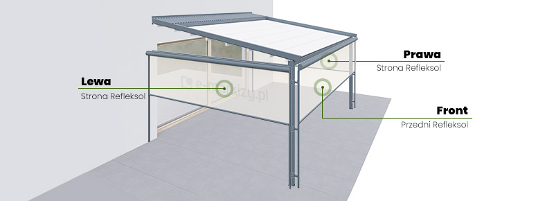 W przypadku montażu bocznego refleksola jedna prowadnica mocowana jest standardowo na uchwytach do podpory, a druga bezpośrednio do ściany (bez uchwytów). W przypadku montażu do pergoli podwójnych refleksoli bocznych, do montażu konieczne jest zastosowanie profila bocznego i dodatkowej podpory pionowej.