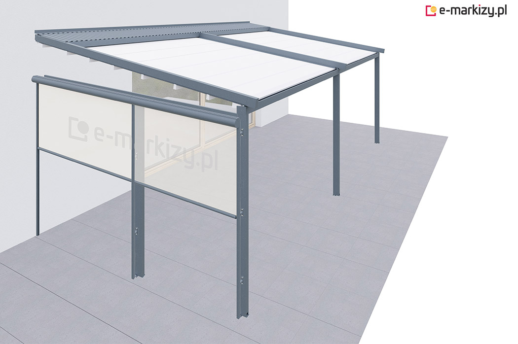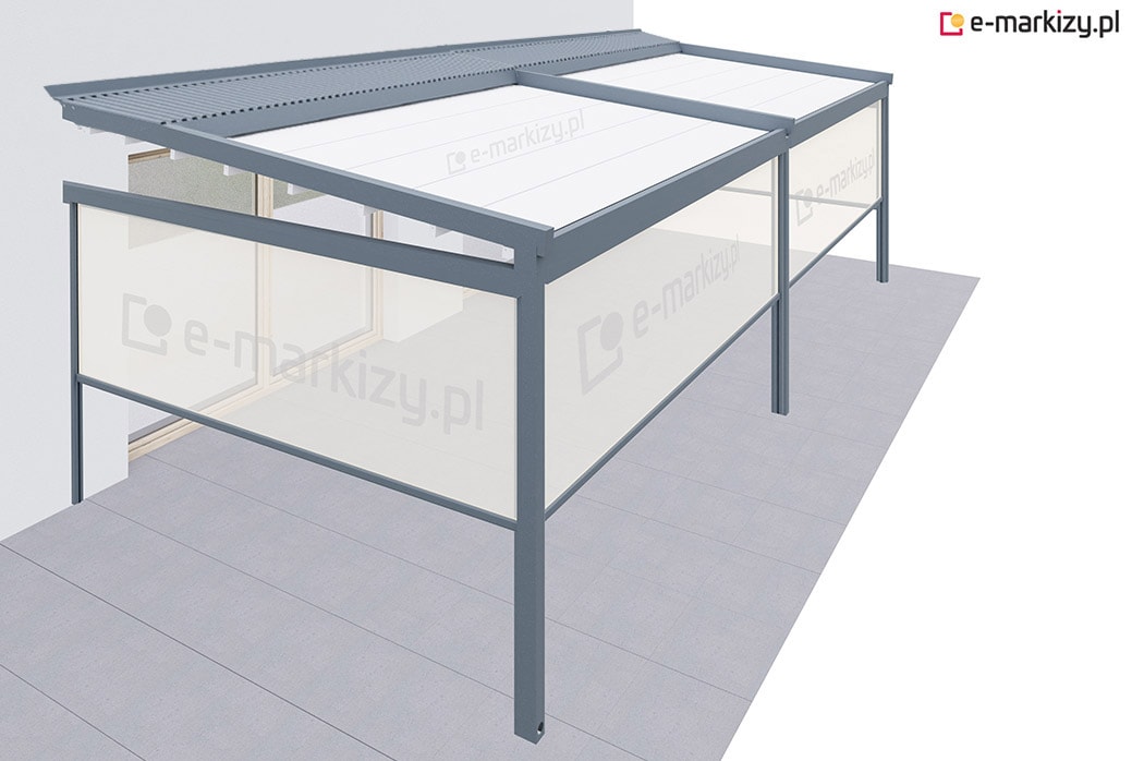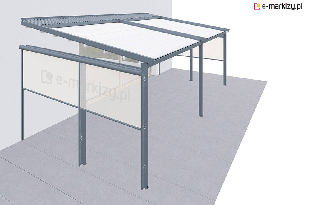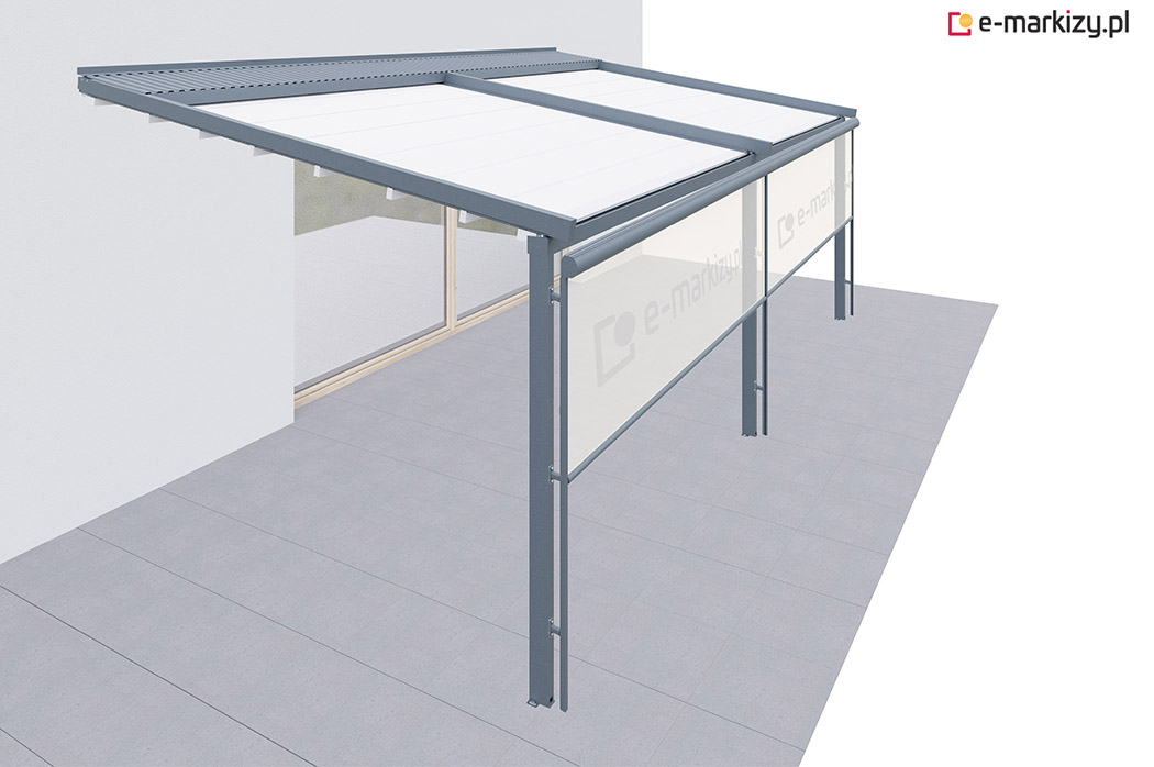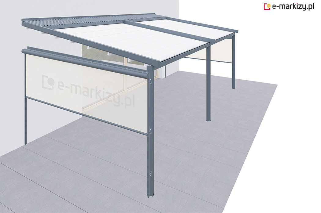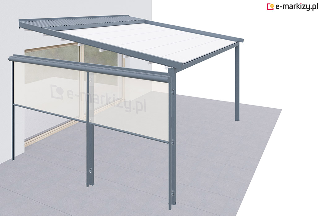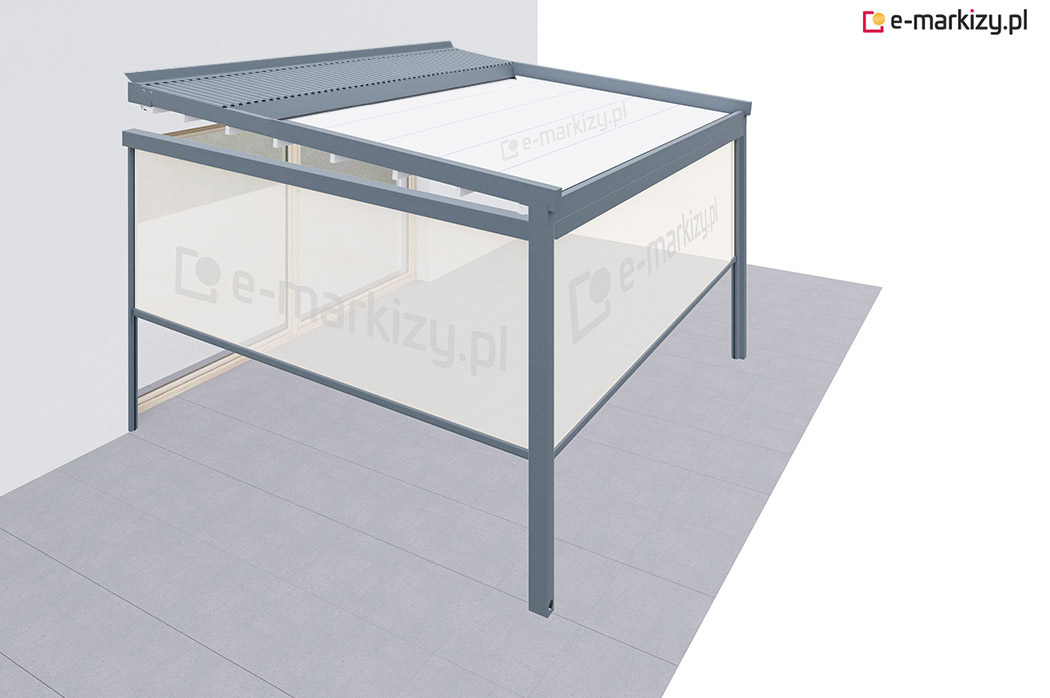 Roleta refleksol typu screen zapewnia osłonę przed wiatrem od frontu i z prawej strony tarasu. Osłona mocowana jest na prowadnicach aluminiowych od zewnątrz konstrukcji pergoli. Sterowanie osłoną boczną odbywa się za pomocą dedykowanego pilota bezprzewodowego.