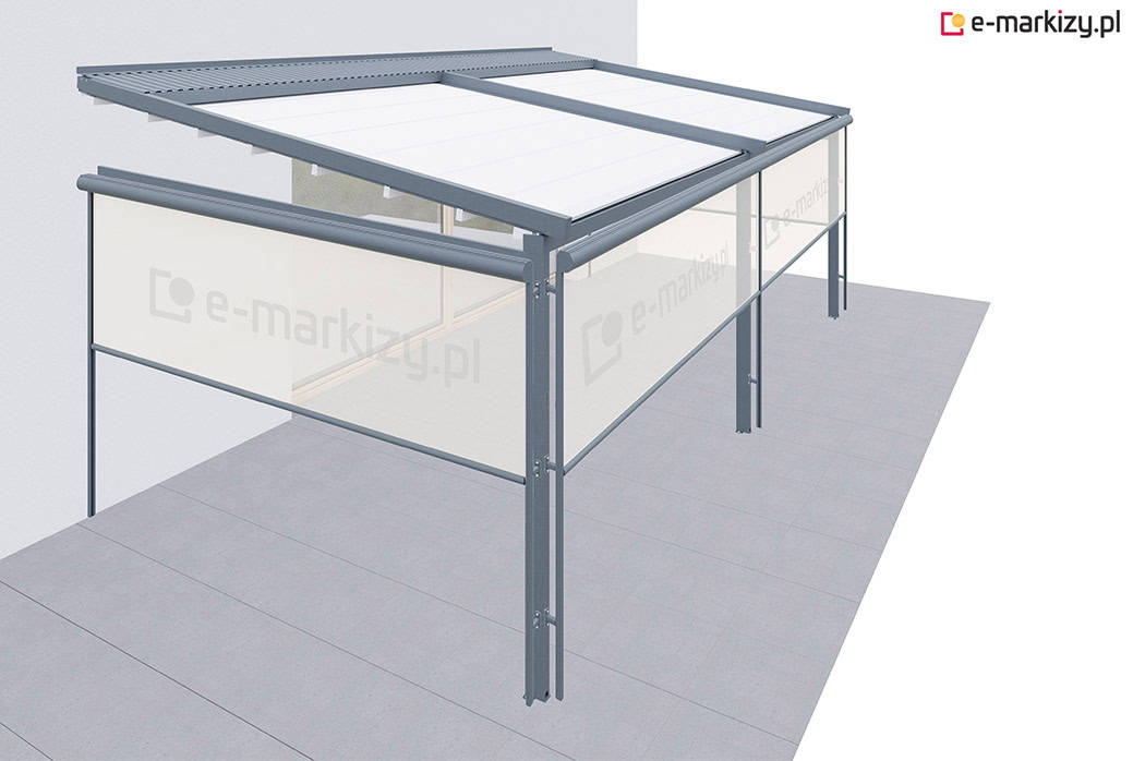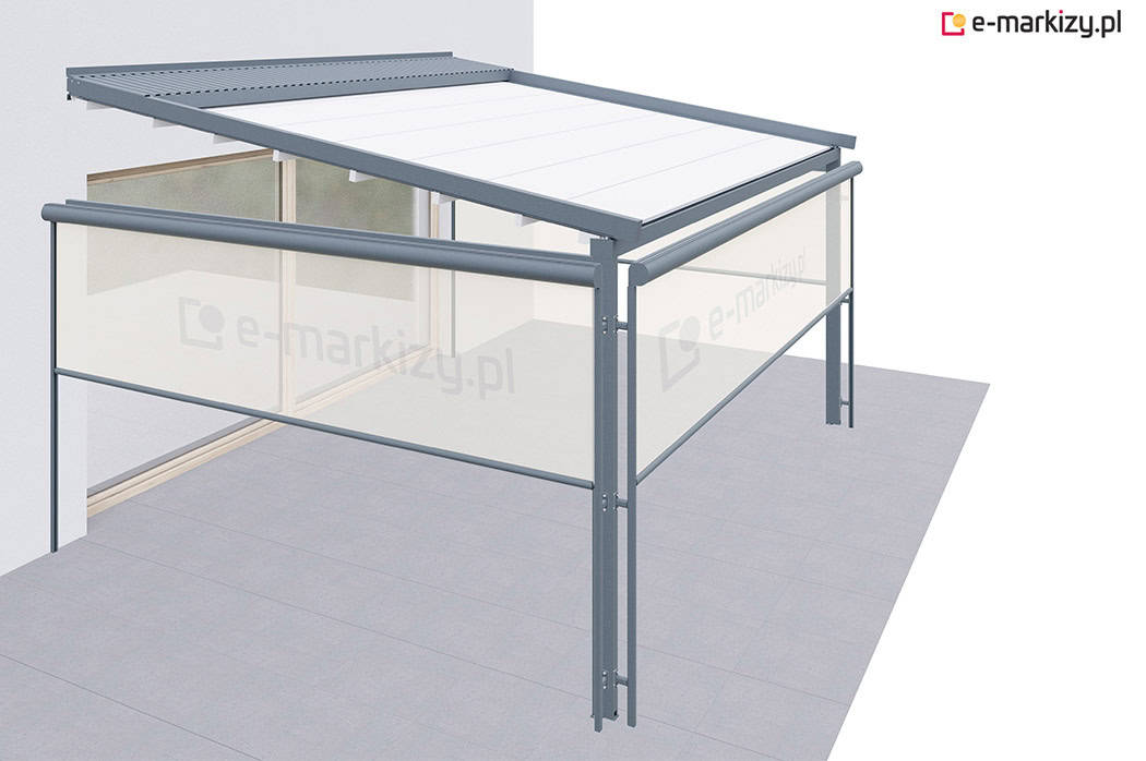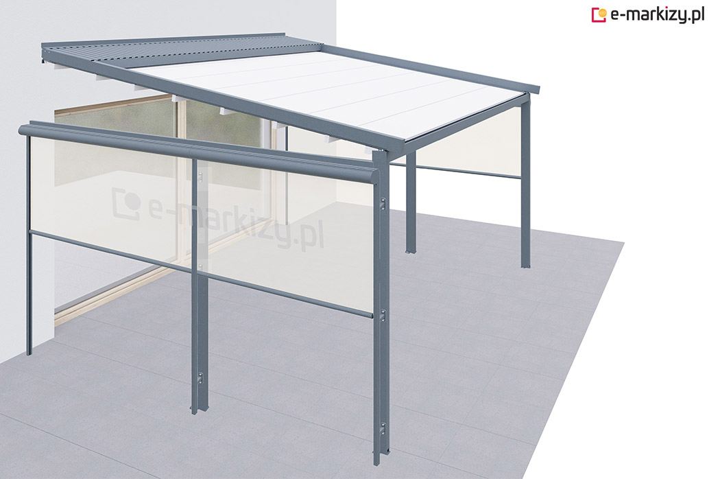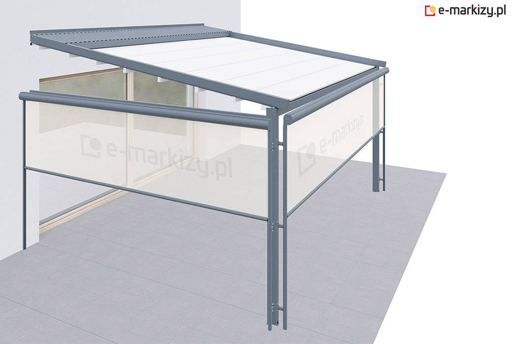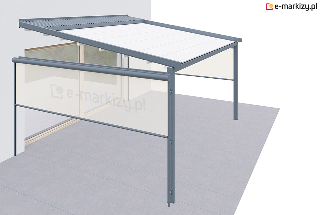 Roleta refleksol typu screen zapewnia osłonę przed wiatrem z prawej i lewej strony tarasu. Osłona mocowana jest na prowadnicach aluminiowych od zewnątrz konstrukcji pergoli. Sterowanie osłoną boczną odbywa się za pomocą dedykowanego pilota bezprzewodowego.