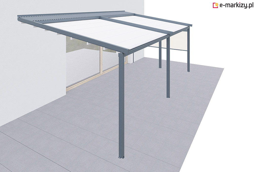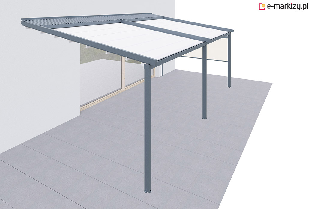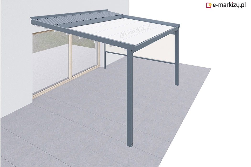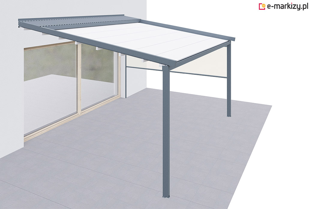 Pergola tarasowa z osłoną typu refleksol ziip z przodu konstrukcji.