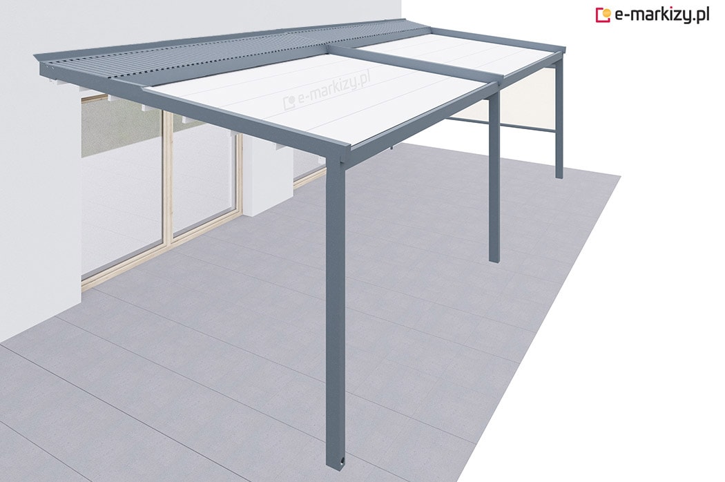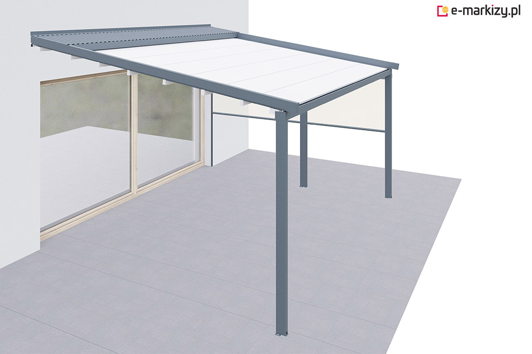 Pergola tarasowa z osłoną typu refleksol półokrągły na uchwytach na boku konstrukcji.