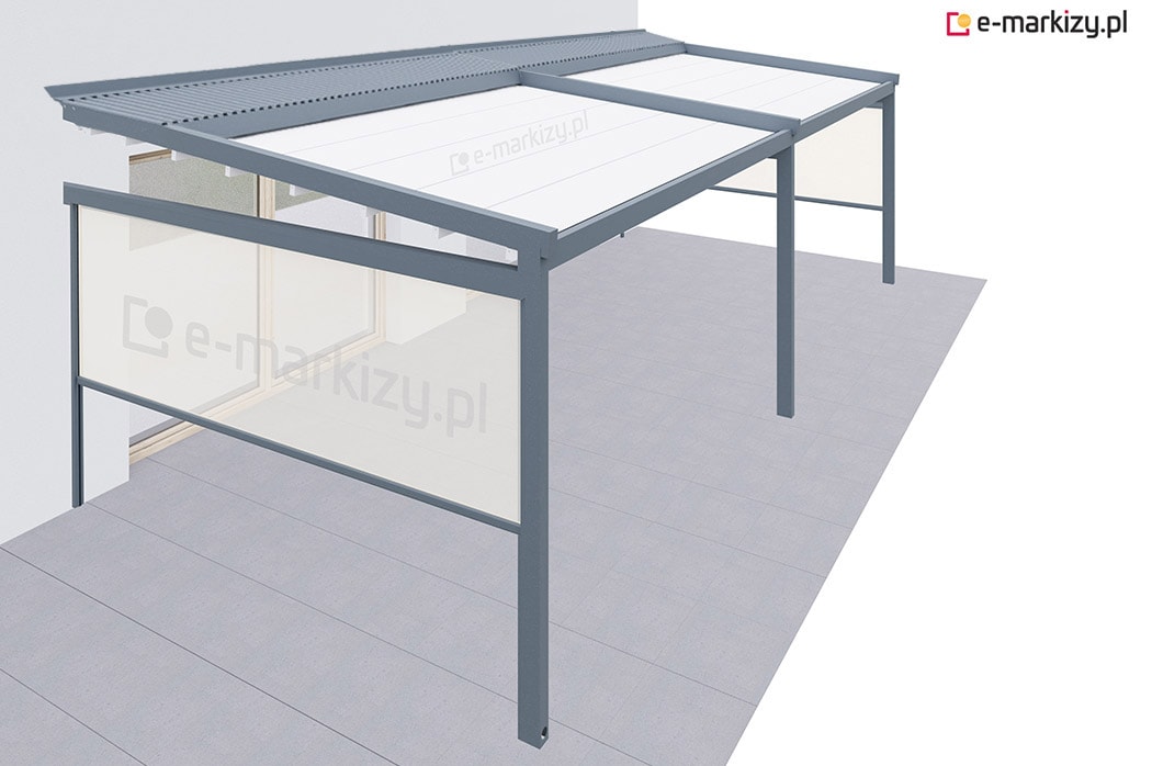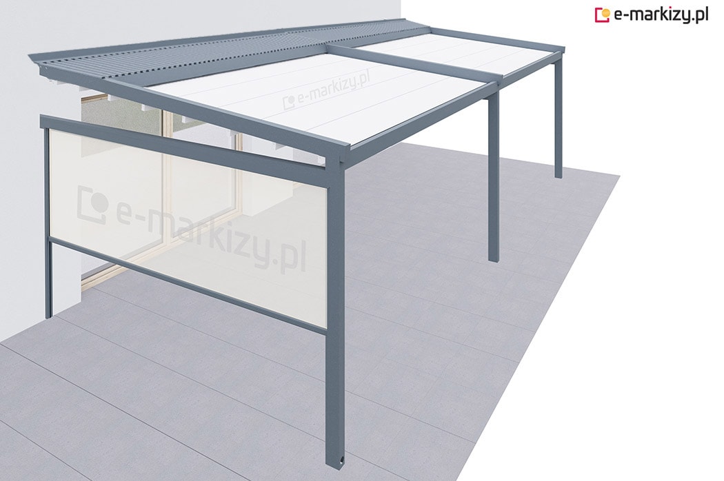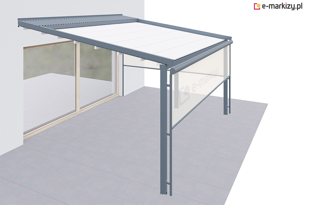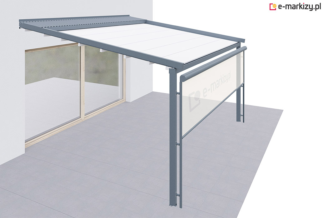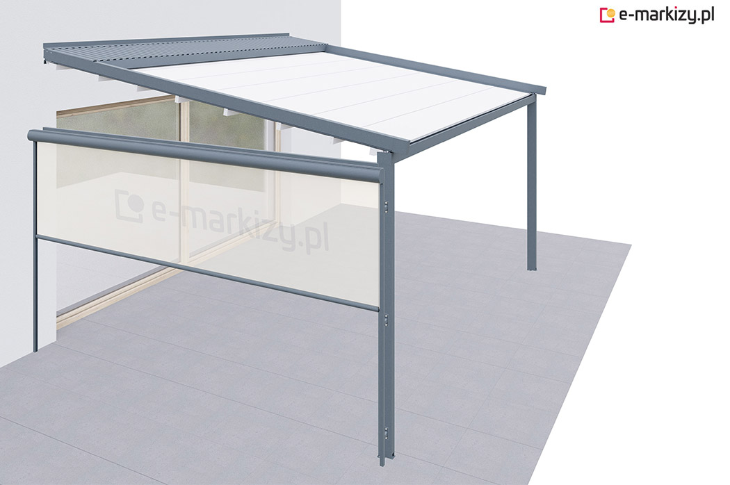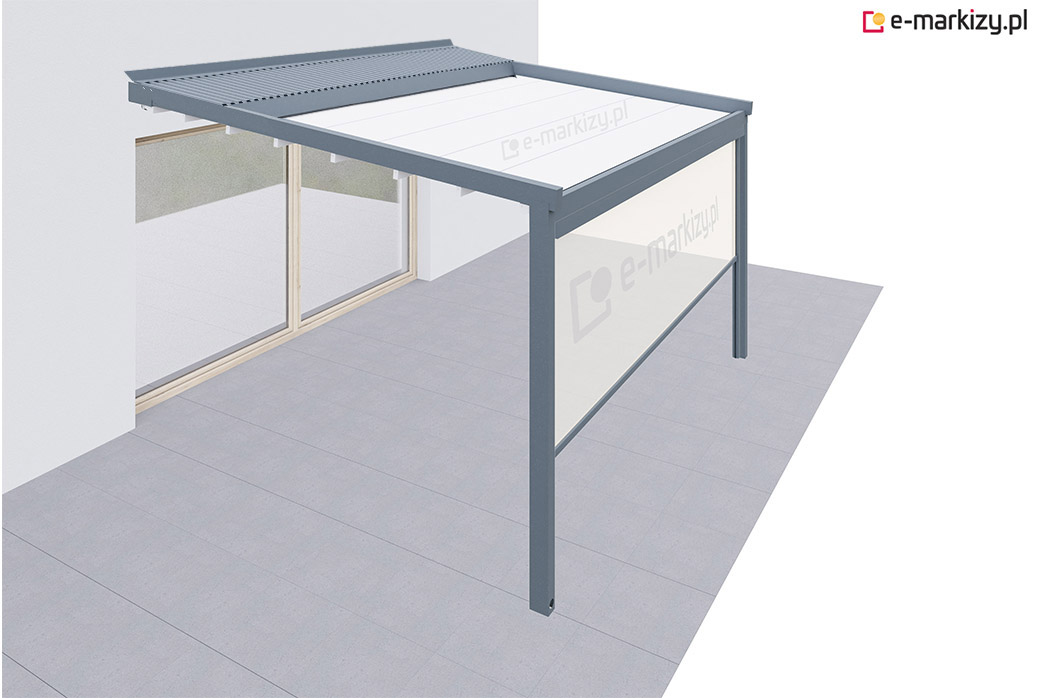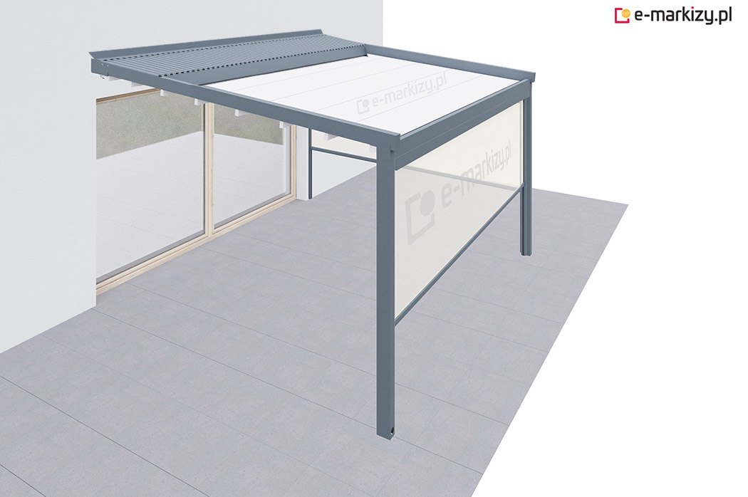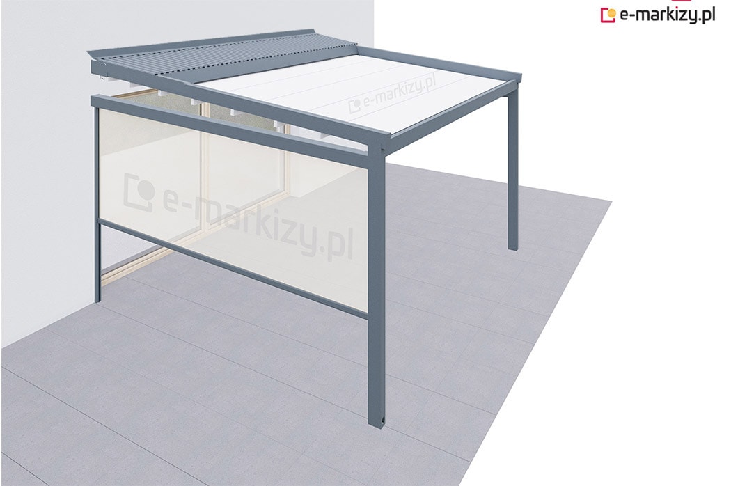 Pergola tarasowa z osłoną typu refleksol ziip na boku konstrukcji.