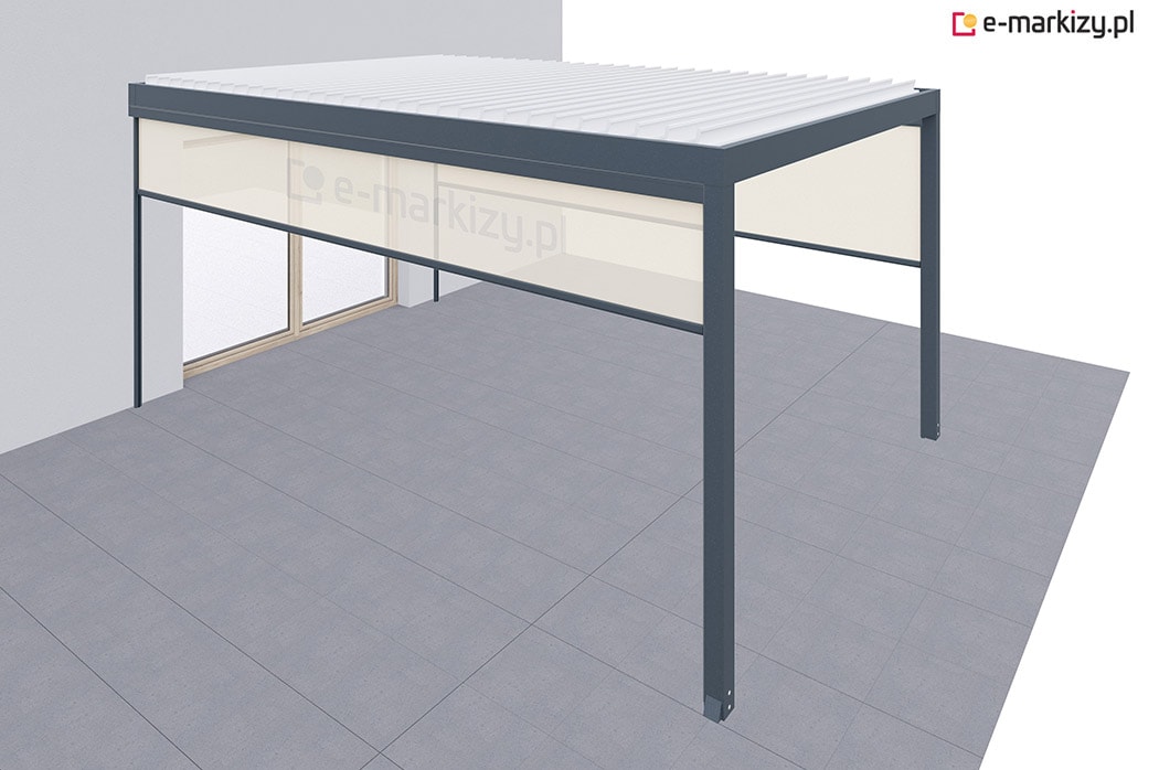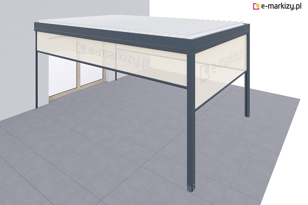 Roleta refleksol typu screen zapewnia osłonę przed wiatrem z prawej strony i od frontu tarasu. Osłony mocowane są na prowadnicach aluminiowych od wewnątrz i od zewnątrz konstrukcji pergoli. Sterowanie wszystkimi osłonami bocznymi odbywa się za pomocą dedykowanego pilota bezprzewodowego.