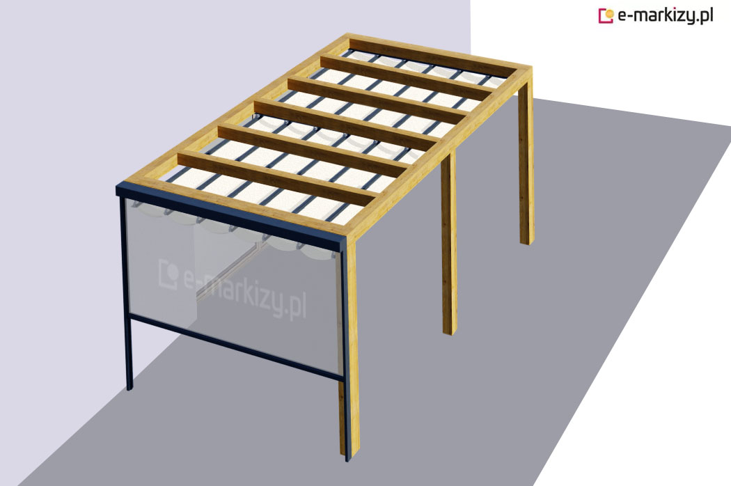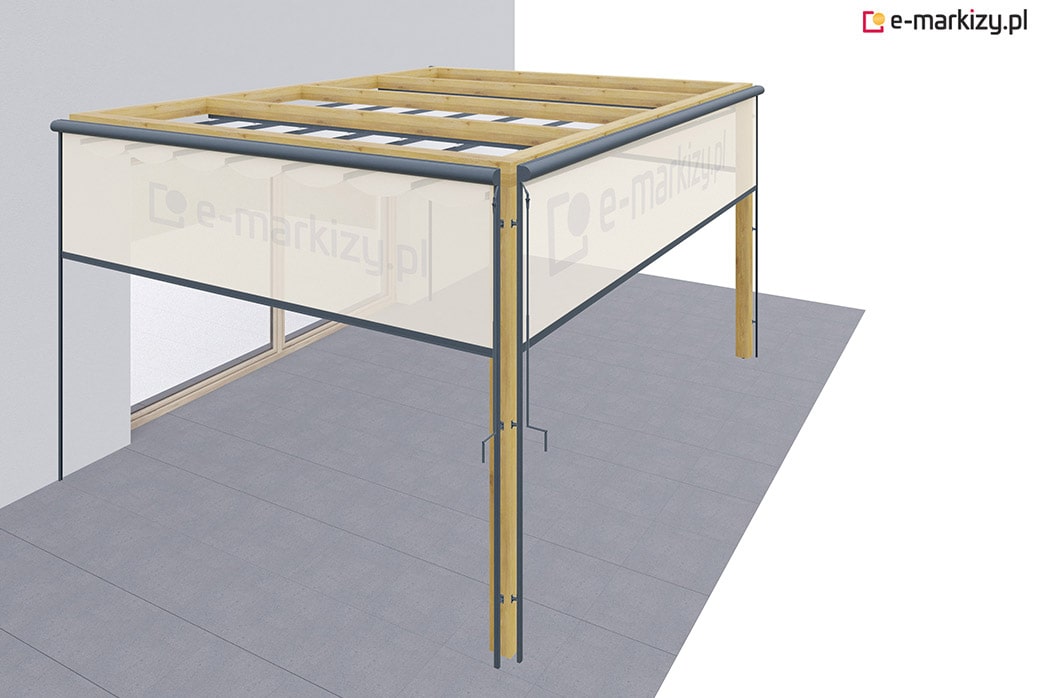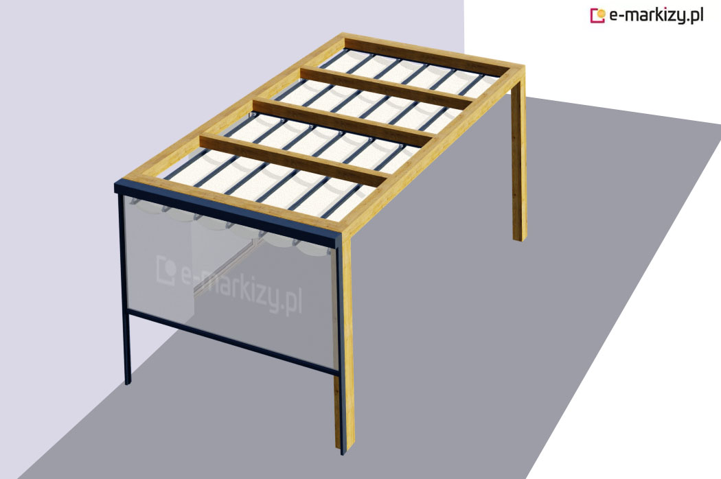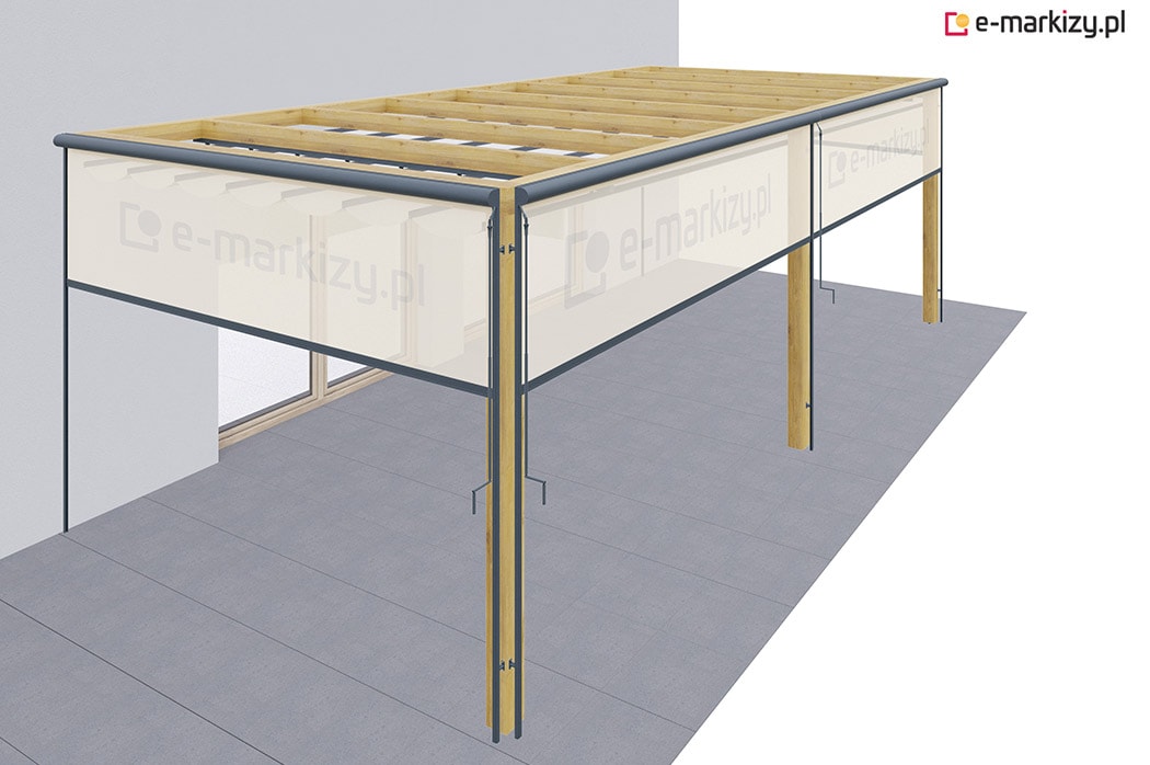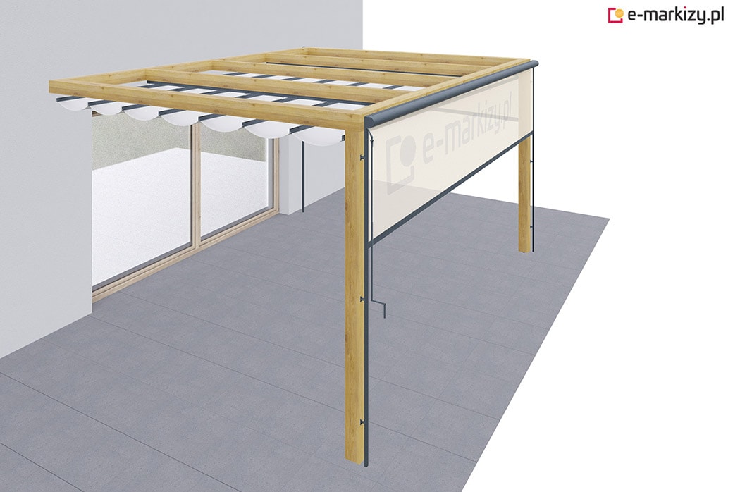 Roleta refleksol typu screen zapewnia osłonę przed wiatrem od frontu i z lewej strony tarasu. Osłona mocowana jest na prowadnicach aluminiowych od zewnątrz konstrukcji pergoli. Sterowanie osłoną boczną odbywa się za pomocą dedykowanego pilota bezprzewodowego.