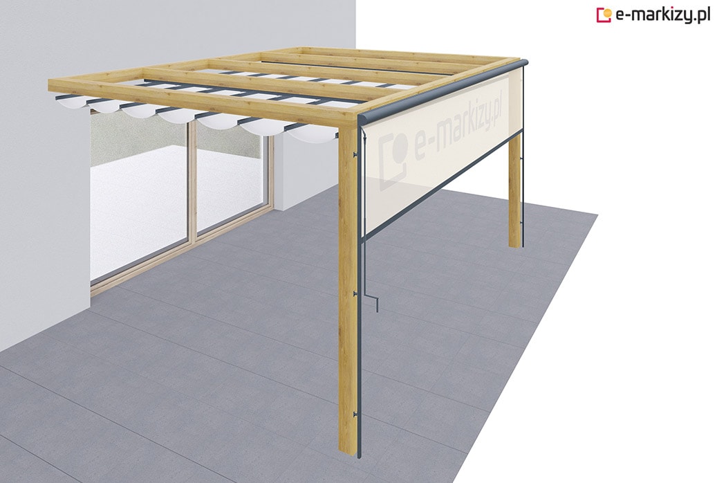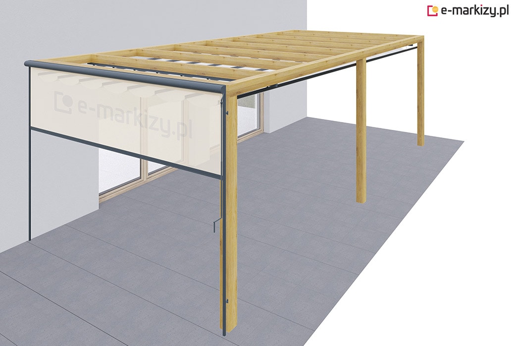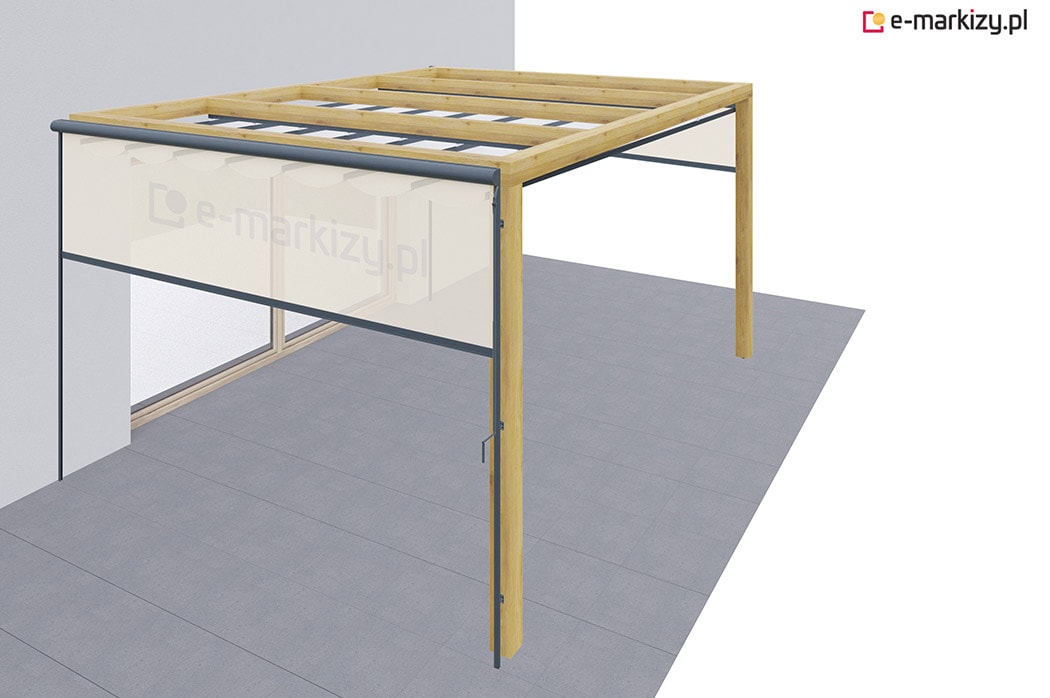 Roleta refleksol typu screen zapewnia osłonę przed wiatrem z prawej strony tarasu. Osłona mocowana jest na prowadnicach aluminiowych od zewnątrz konstrukcji pergoli. Sterowanie osłoną boczną odbywa się za pomocą korby lub dedykowanego pilota bezprzewodowego.