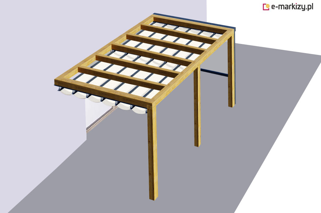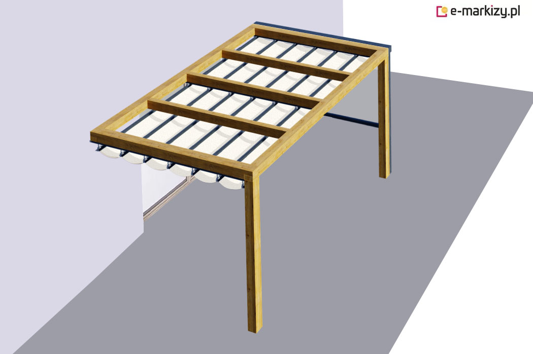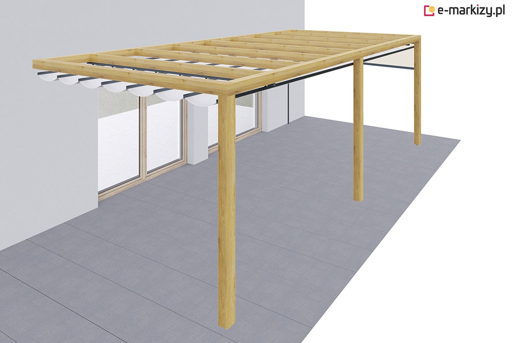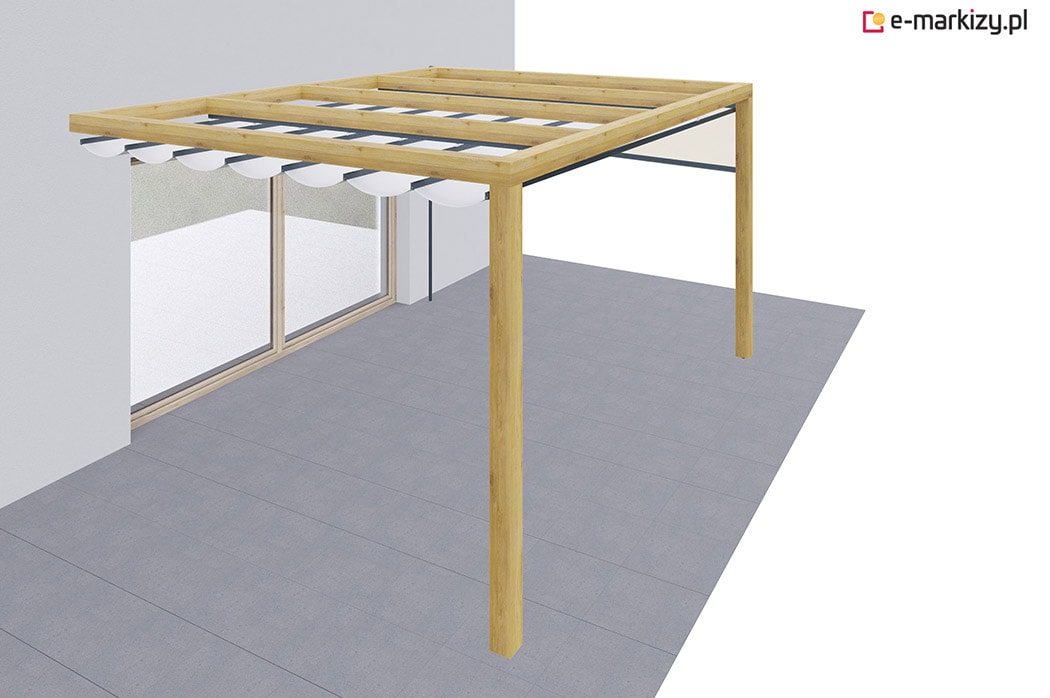 Pergola drewniana z osłoną typu refleksol półokrągły na uchwytach na boku konstrukcji.
