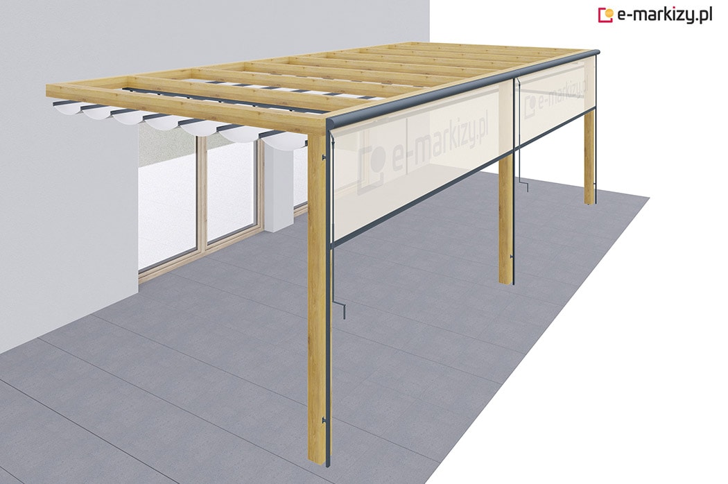 Roleta refleksol typu screen zapewnia osłonę przed wiatrem od frontu i z lewej strony tarasu. Osłona mocowana jest na prowadnicach aluminiowych od zewnątrz konstrukcji pergoli. Sterowanie osłoną boczną odbywa się za pomocą korby lub dedykowanego pilota bezprzewodowego.