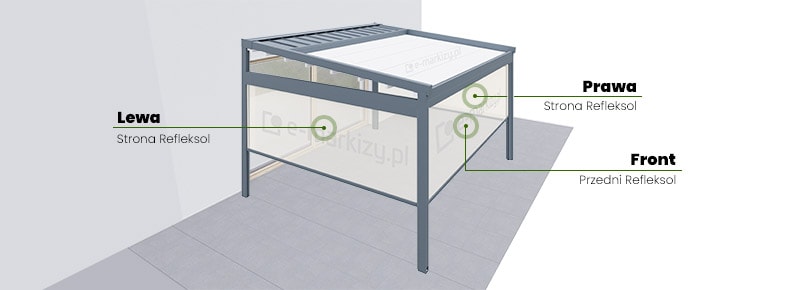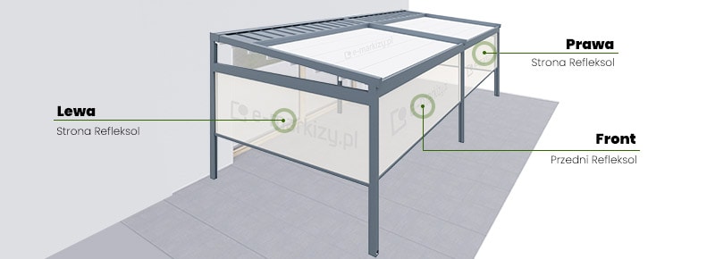 Roleta refleksol typu screen zapewnia osłonę przed wiatrem z prawej i lewej strony oraz od frontu tarasu. Osłony mocowane są na prowadnicach aluminiowych od wewnątrz i od zewnątrz konstrukcji pergoli. Sterowanie wszystkimi osłonami bocznymi odbywa się za pomocą dedykowanego pilota bezprzewodowego.