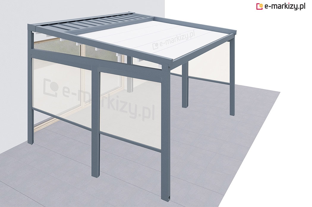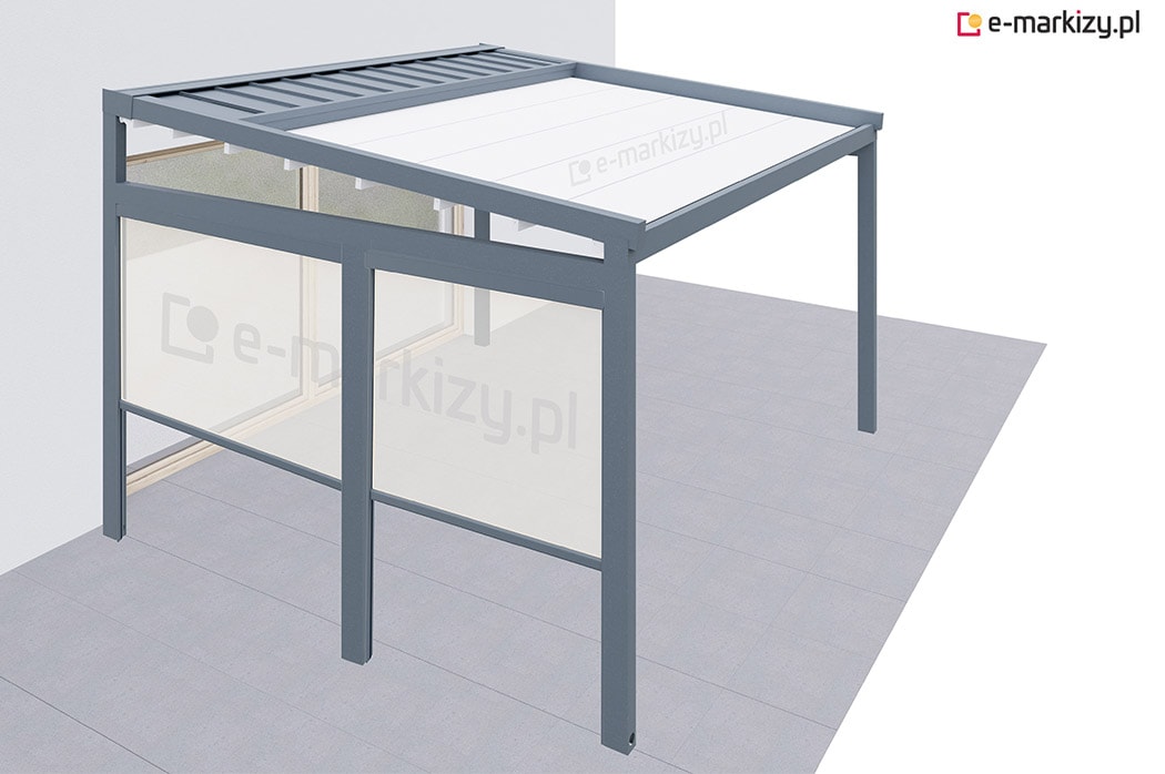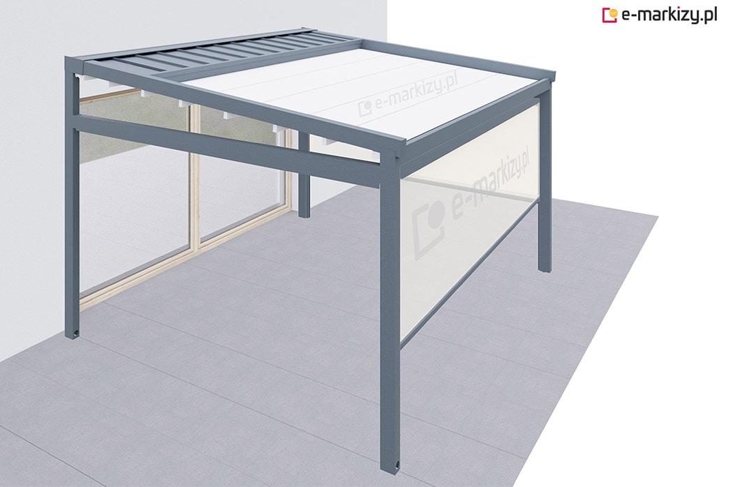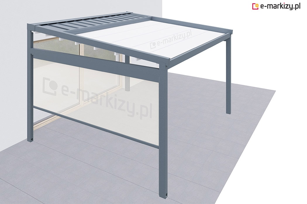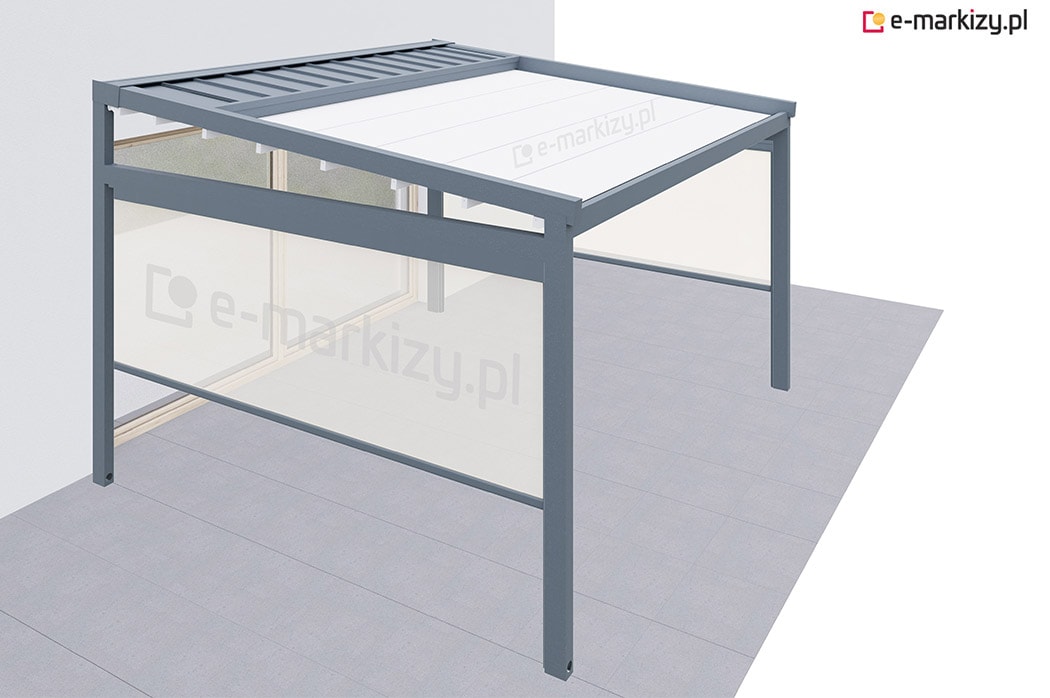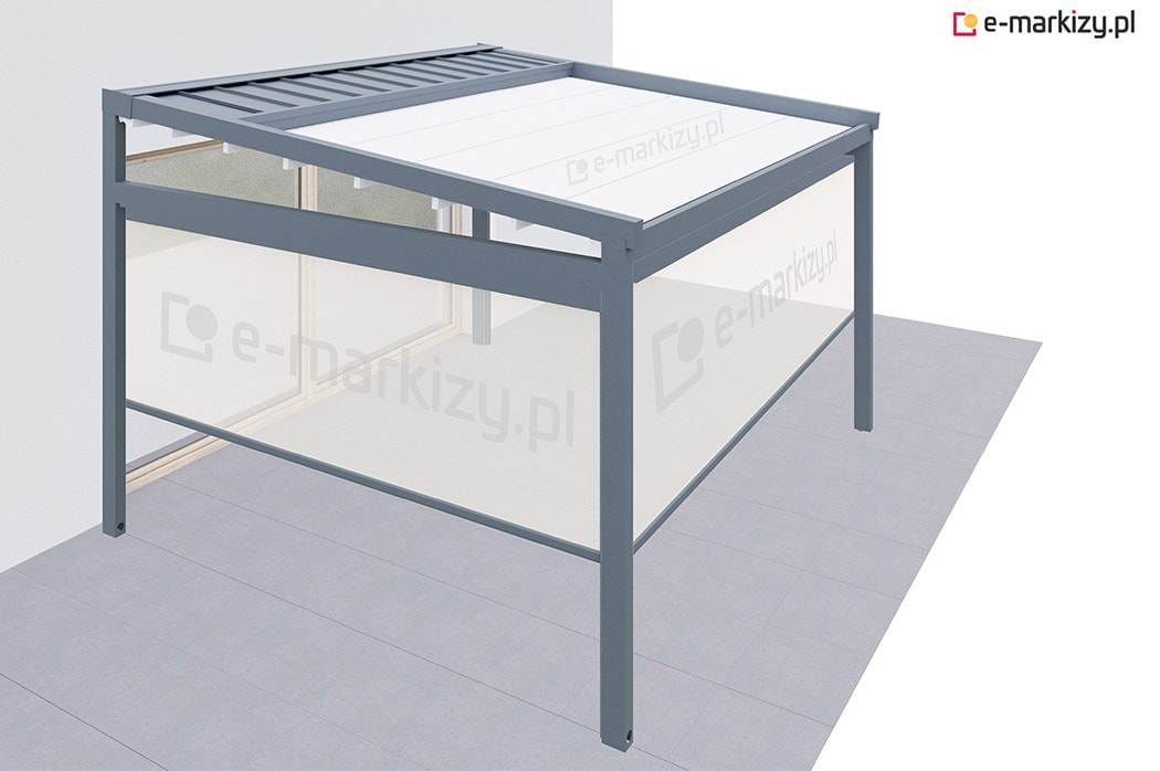 Pergola tarasowa z osłoną typu refleksol ziip na boku konstrukcji.