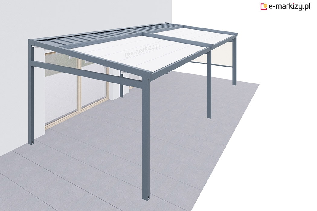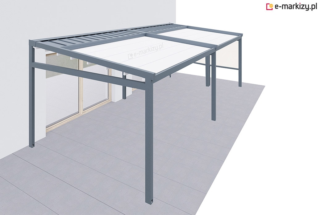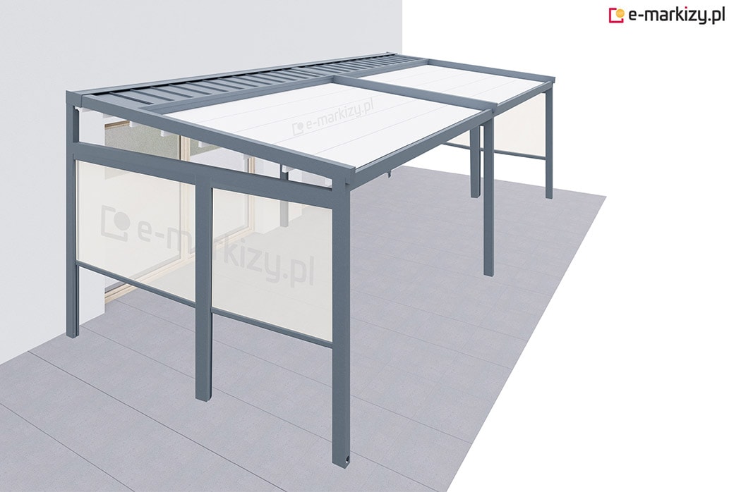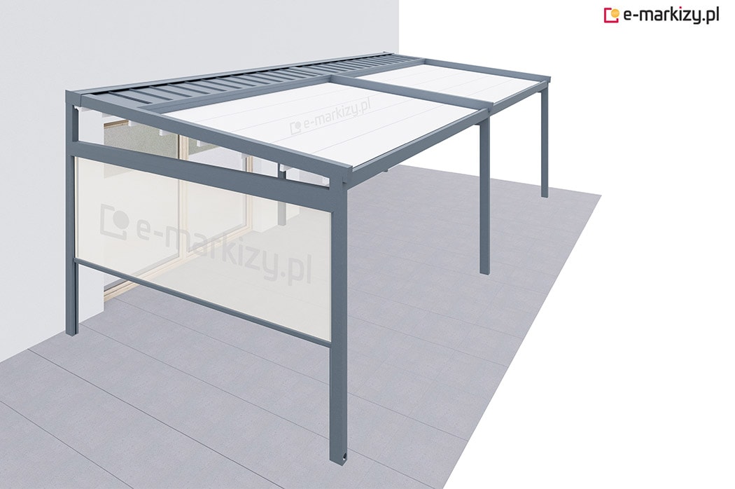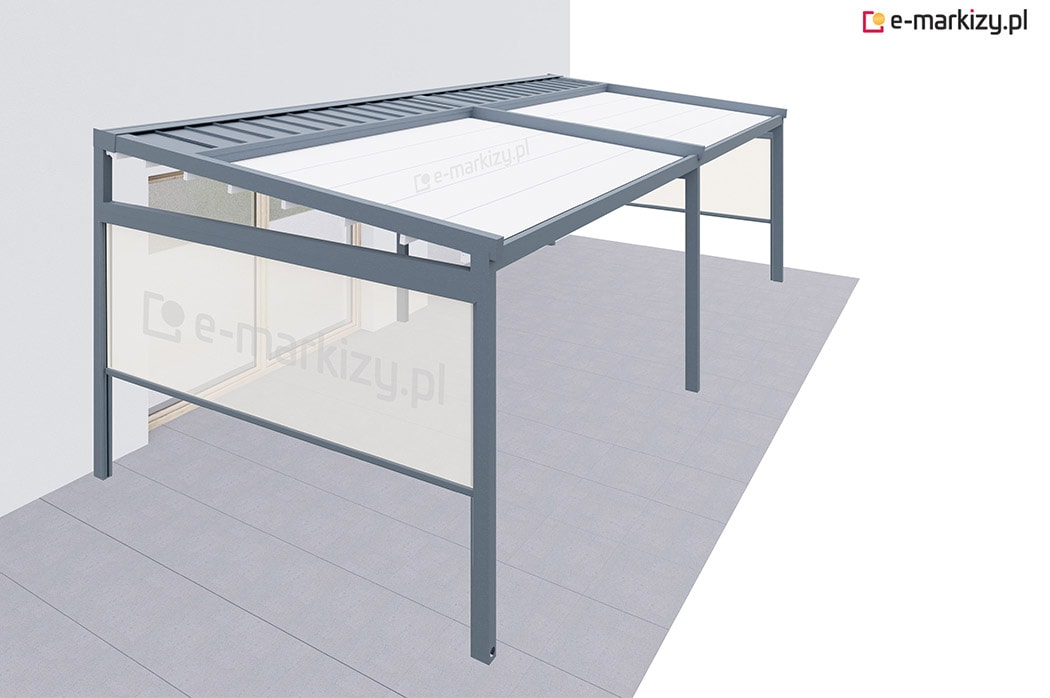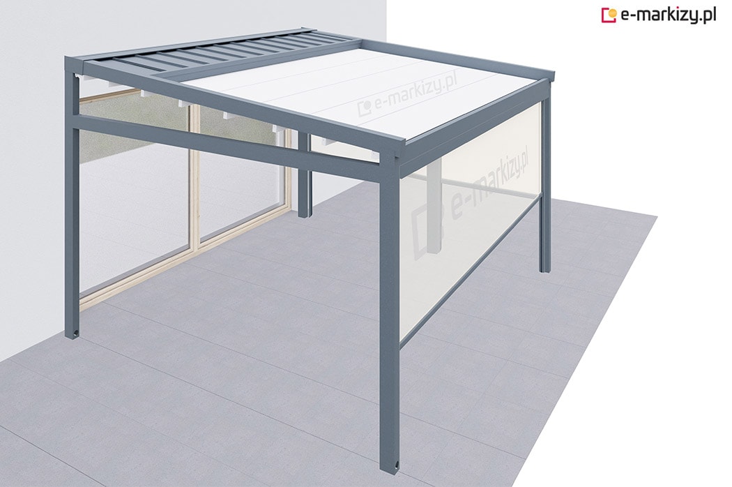Pergola tarasowa z osłoną typu refleksol ziip na boku konstrukcji.