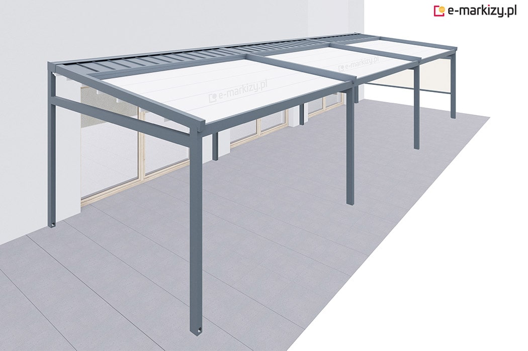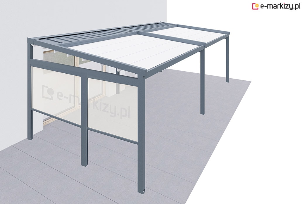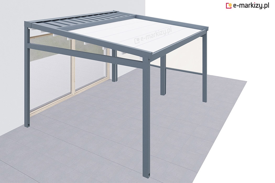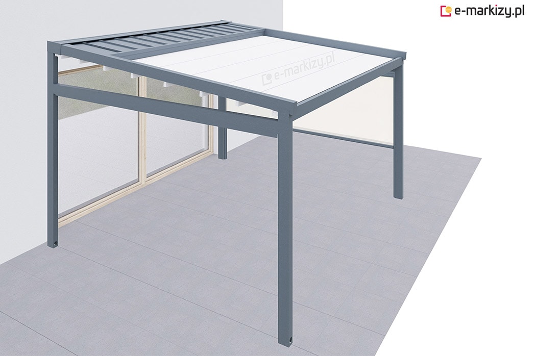 Pergola tarasowa z osłoną typu refleksol ziip z przodu konstrukcji.