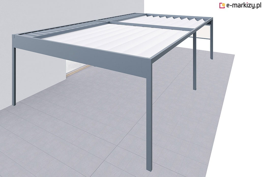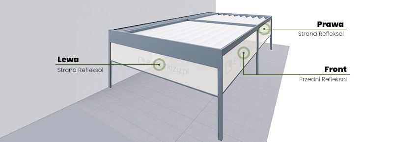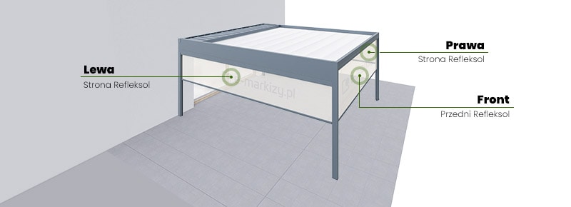 Zależnie od szerokości pergoli, posiada ona inną ilość podpór oraz refleksoli. Osłony przednie montujemy do frontu konstrukcji pergoli.