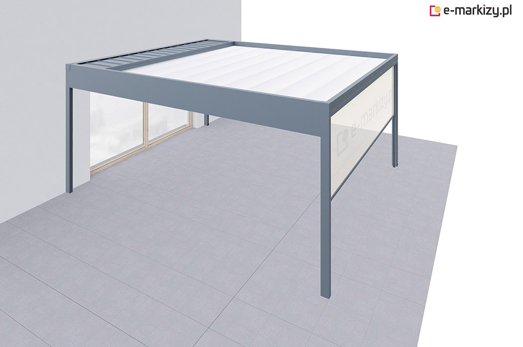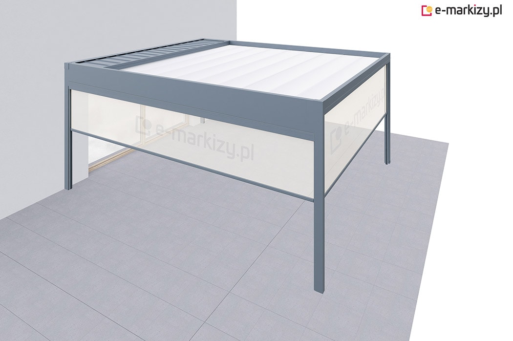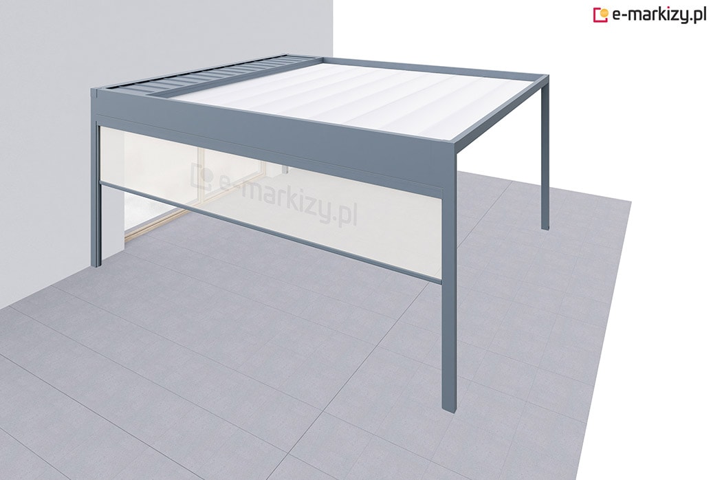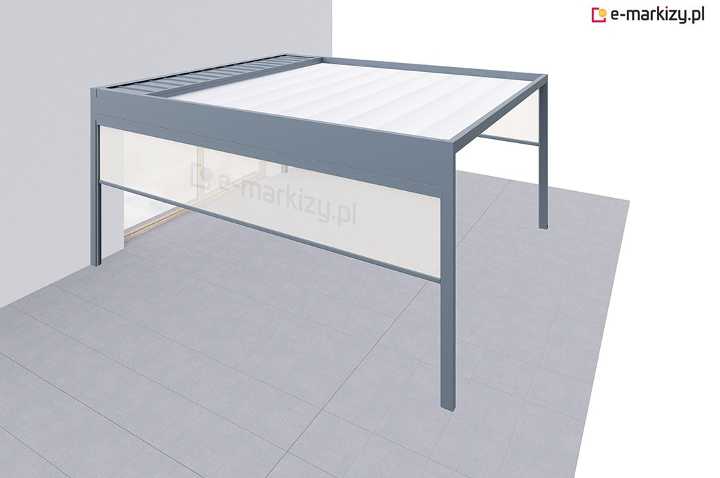 Pergola tarasowa z osłoną typu refleksol ziip na boku konstrukcji.