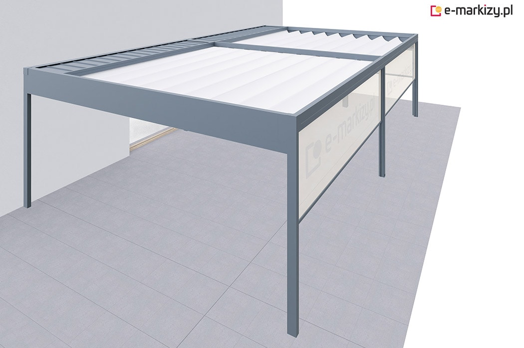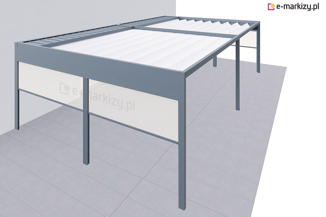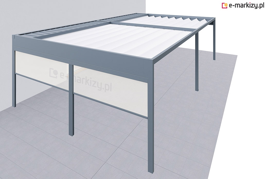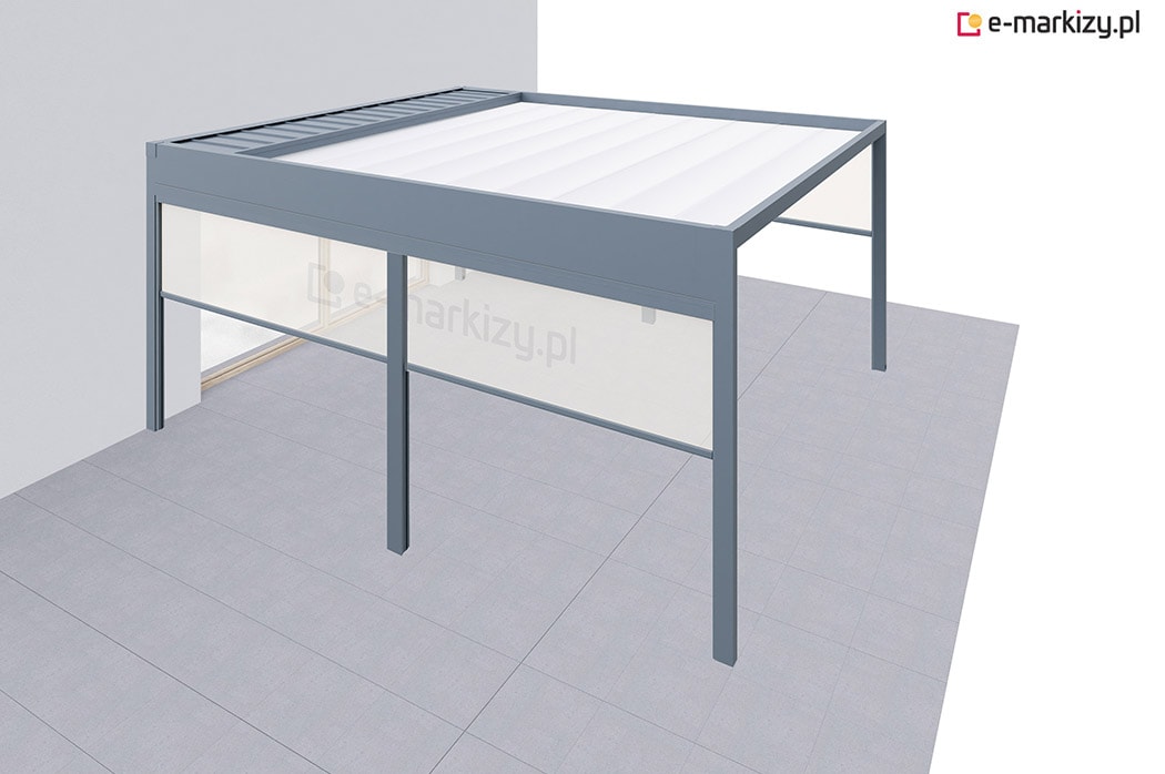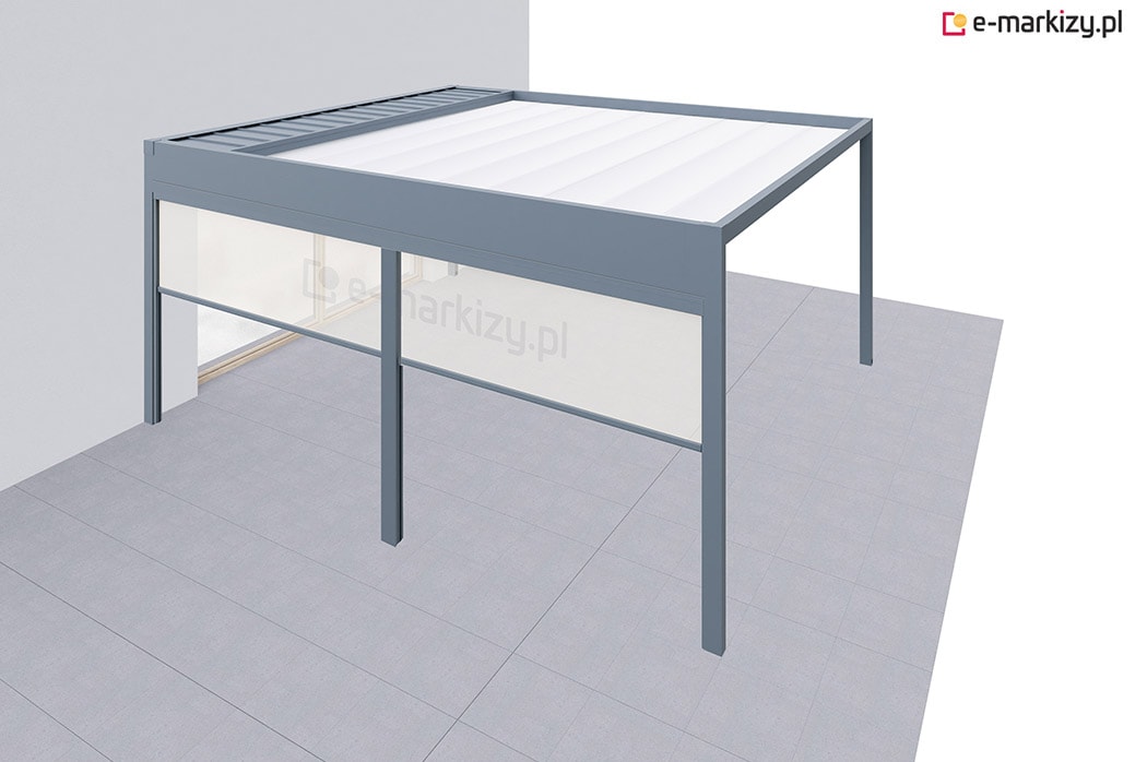 Pergola tarasowa z osłoną typu refleksol ziip na boku konstrukcji.
