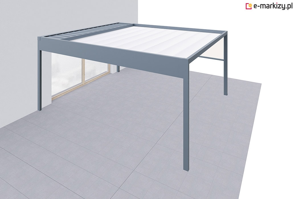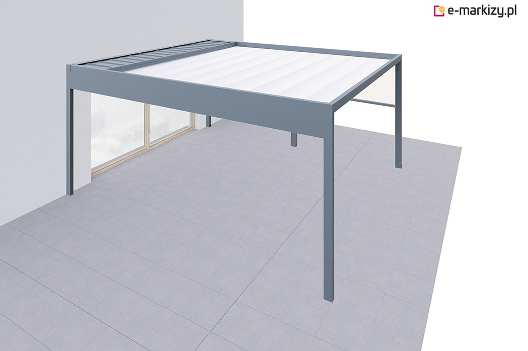 Pergola tarasowa z osłoną typu refleksol ziip z przodu konstrukcji.