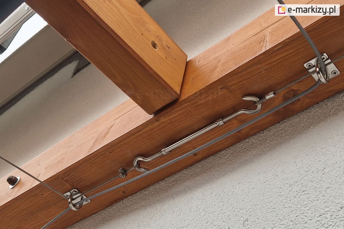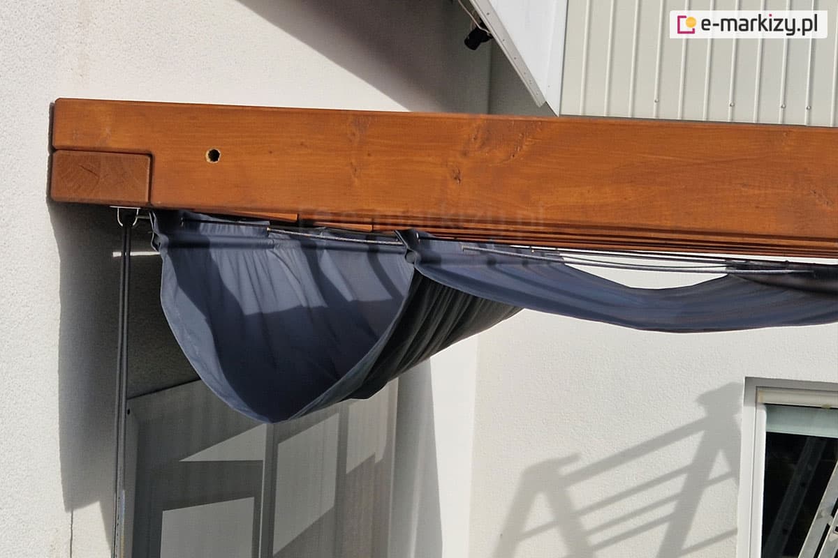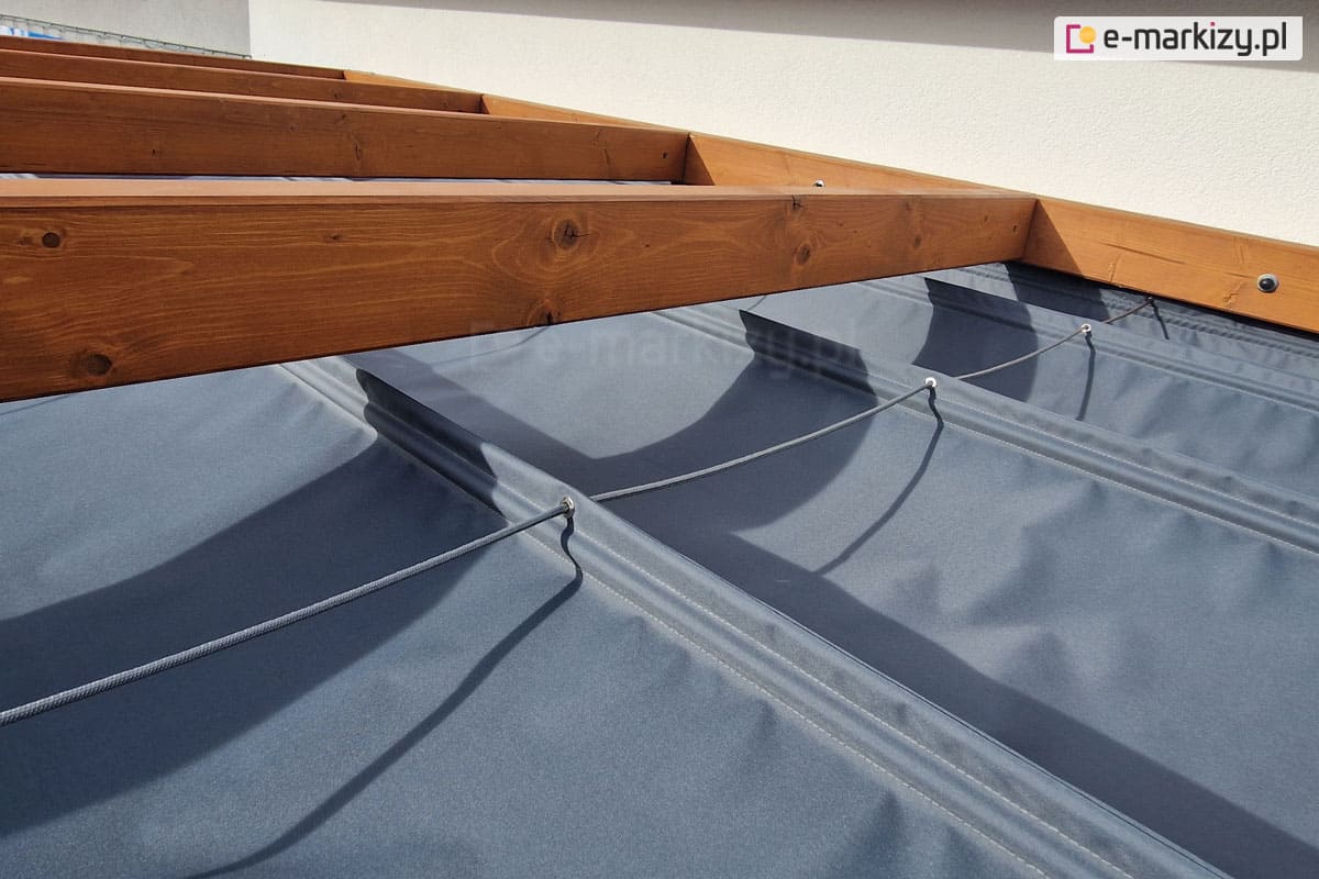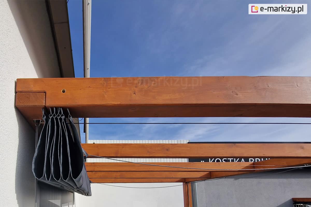 Zadaszenie tkaninowe Risto może być podwieszone do dowolnego rodzaju konstrukcji tarasowej lub ogrodowej. System linek sterujących tkaniną dachu przewlekany jest przez mocowania pod konstrukcją. Cały pakiet tkaniny wraz z elementami mieści się pod konstrukcją, do której jest mocowany dach rzymski. Poniżej znajdują się zdjęcia z realizacji montażu daszka do konstrukcji drewnianych, ale mogą to być także konstrukcje aluminiowe, stalowe lub betonowe.