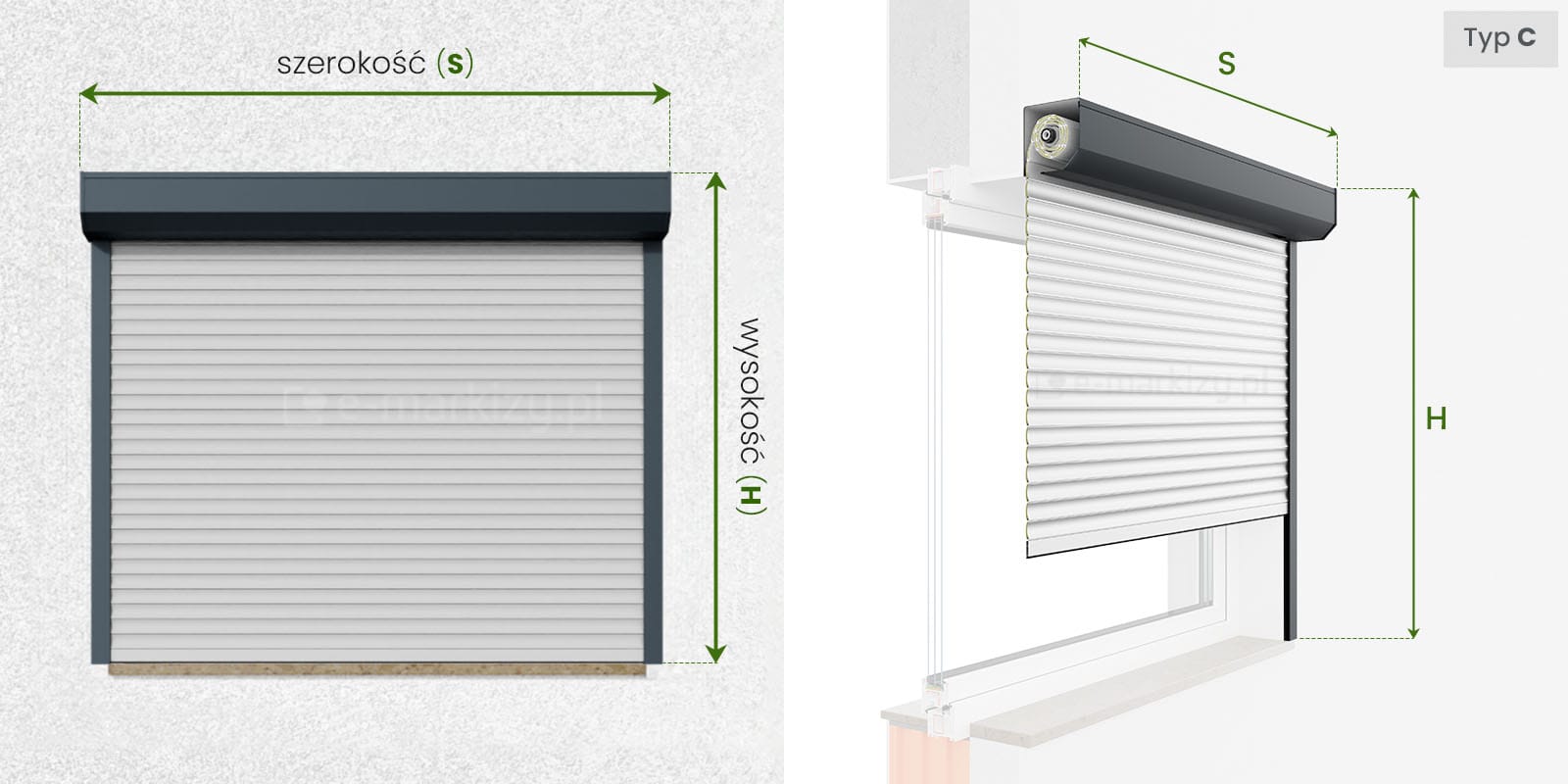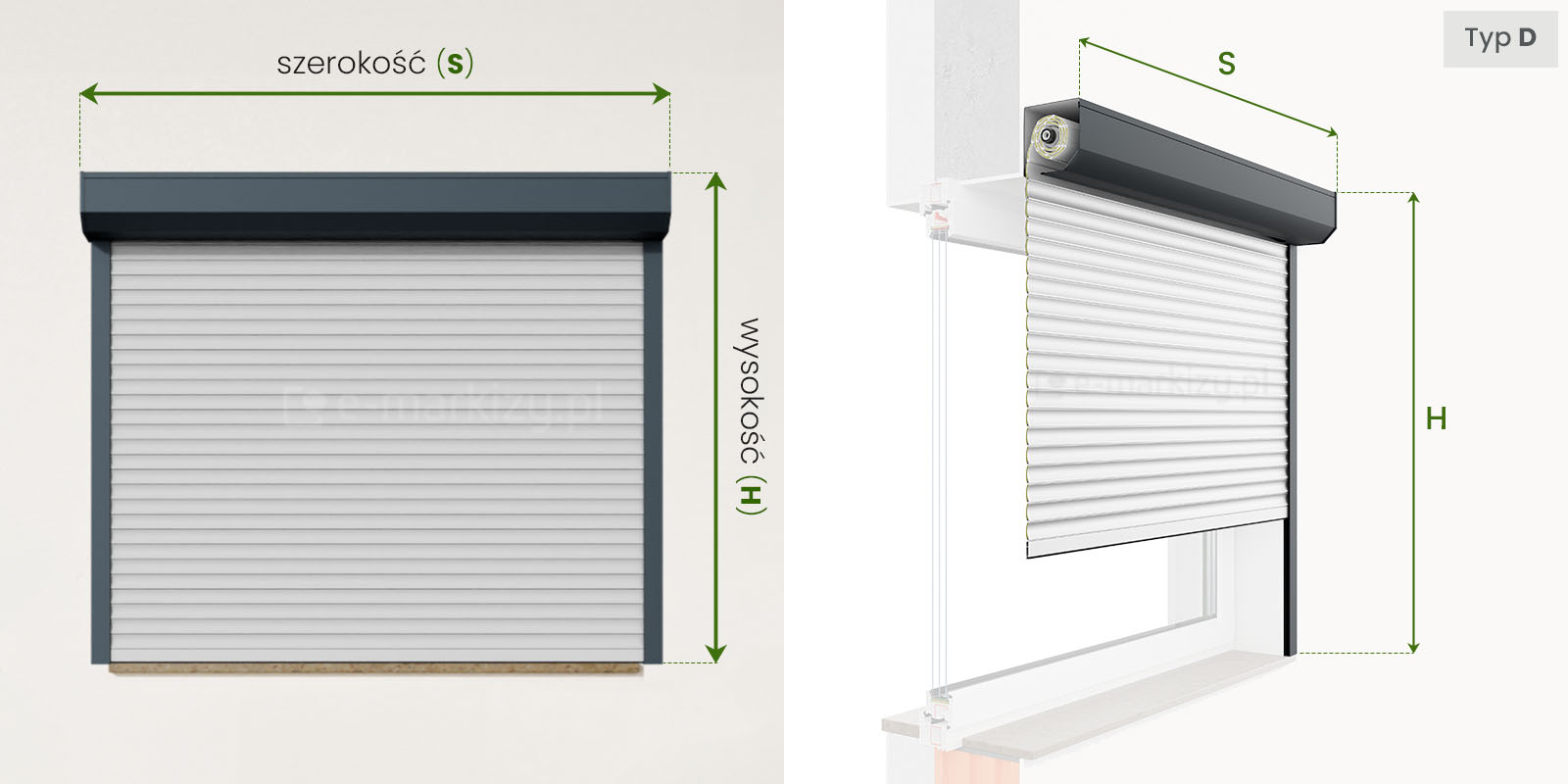 Szczegóły pomiaru rolety przy montażu na ścianie (typ C, typ D)