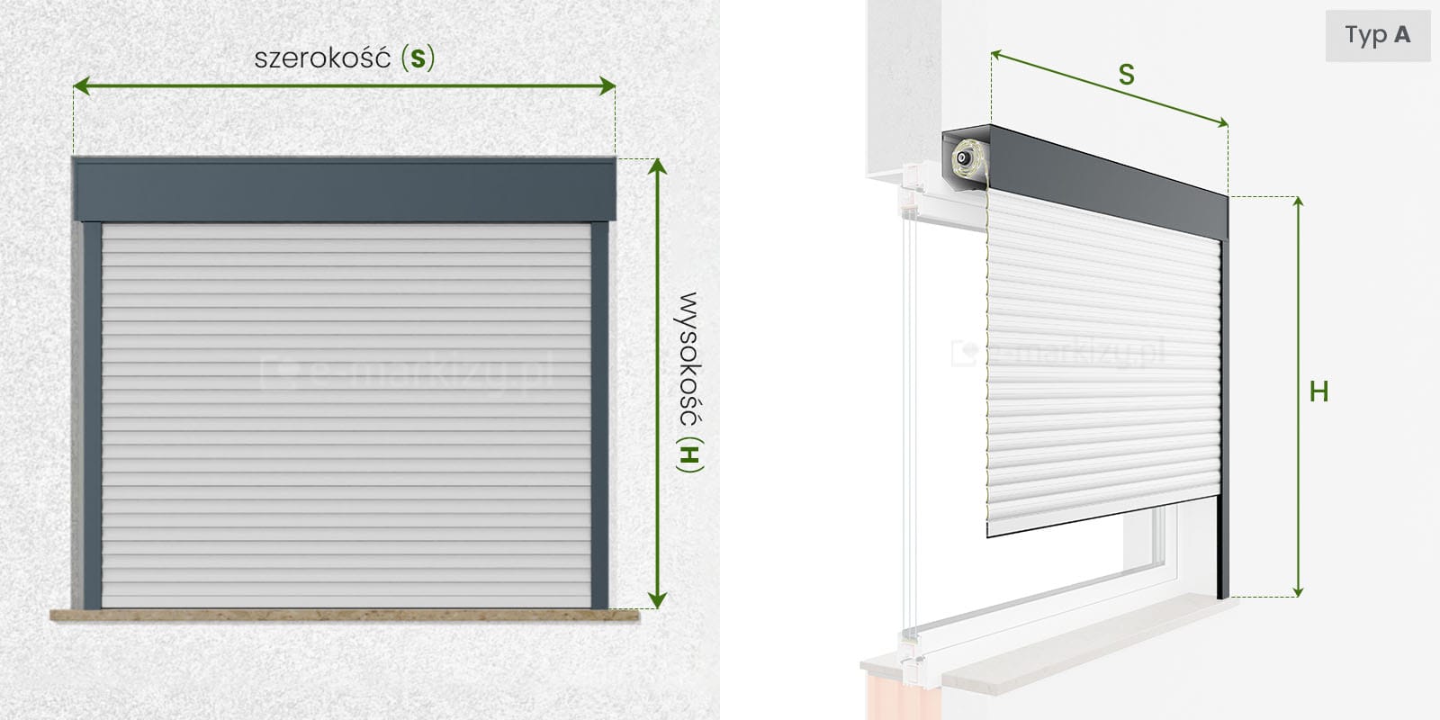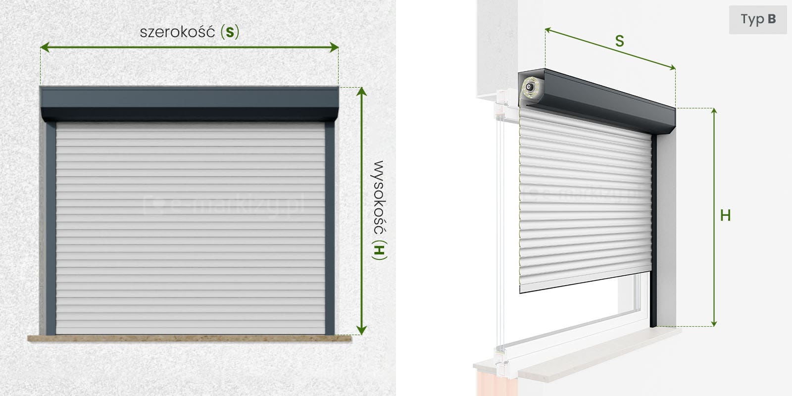 Szczegóły pomiaru rolety przy montażu we wnęce (typ A, typ B)