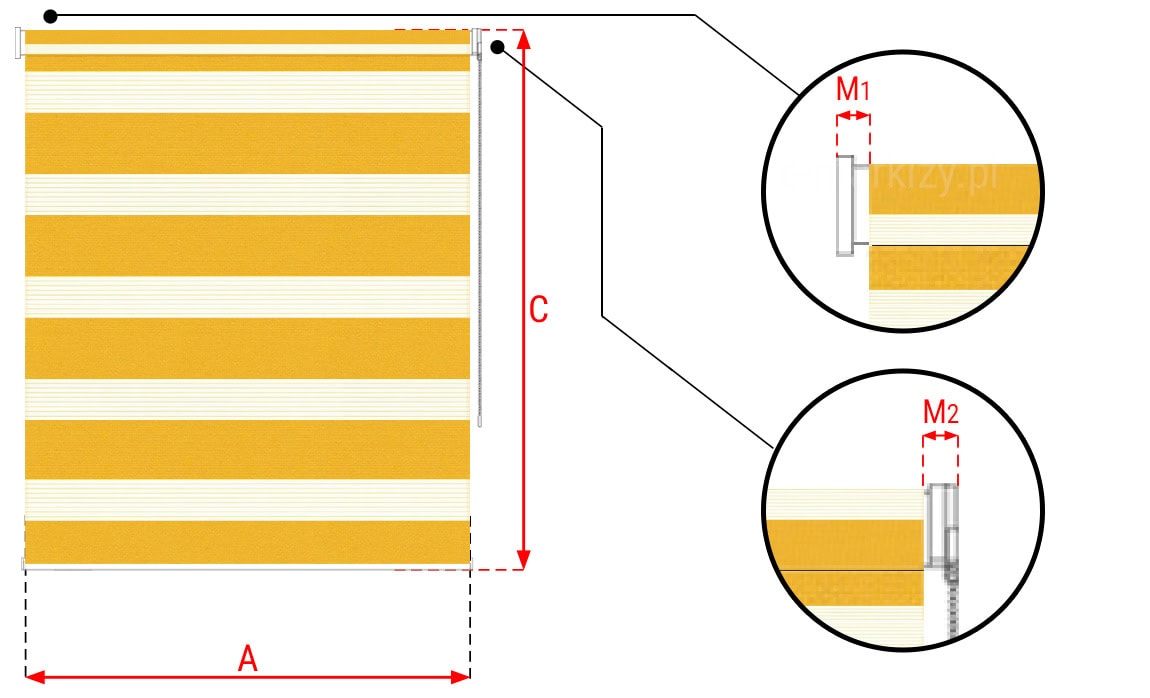 Wymiar M1, M2 – To szerokość uchwytów montażowych rolety, które poszerzają system średnio o ok. 2cm (wymiar M) z każdej strony, w zależności od wybranej rolety. Szczególnie należy to uwzględnić przy montażu wnękowym