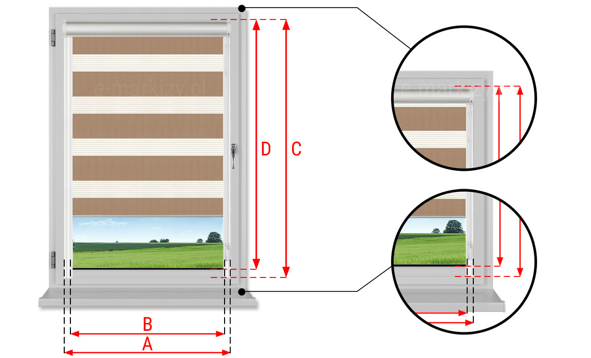 Roleta LUX dzień i noc produkowana jest na wymiar. Maksymalna szerokość to 200cm a wysokość to 300cm. Wielkość kasety różni się w zależności od wymiarów rolety.