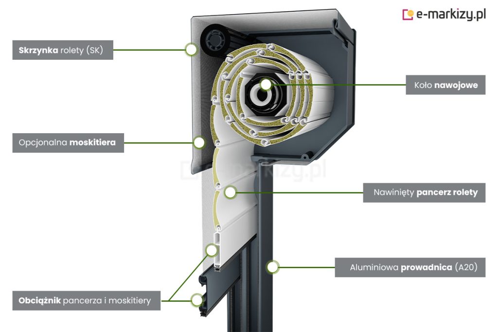 - wysoka jakość i estetyka wykonania – konstrukcja rolety wykonana jest z aluminium pokrytego podwójną warstwą lakierowania, bogata kolorystyka elementów rolety pozwala na dobranie barwy rolety do elewacji, zastosowanie wysokiej jakości aluminium zapewnia trwałość produktów, a dwukrotne lakierowanie zabezpiecza go przed zarysowaniami,
