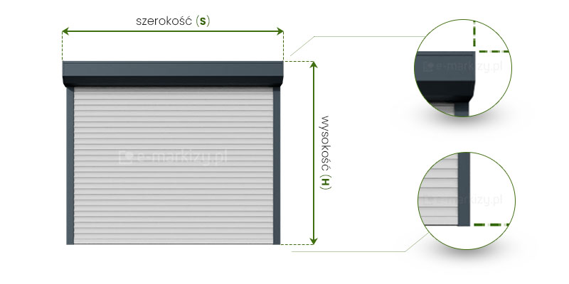 Szerokość całkowita obejmuje szerokość skrzyni, do której zwijany jest pancerz rolety. Wysokość z kolei to całkowita długość skrzyni wraz z prowadnicami.