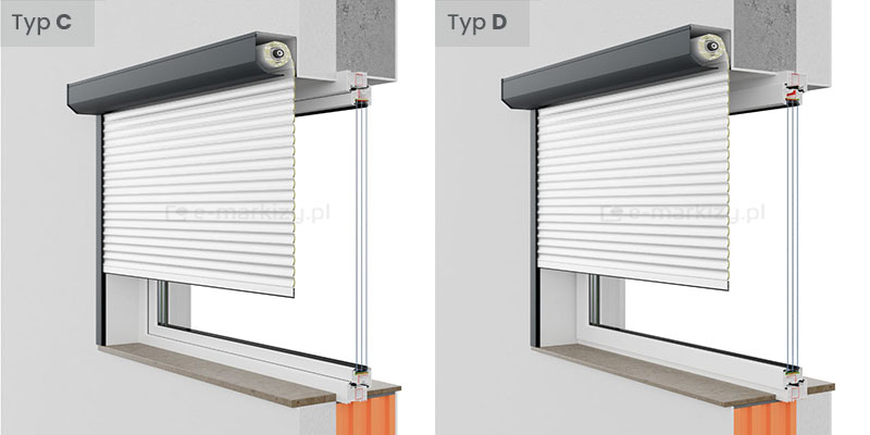 - montaż na ścianie pokoju (typ D) – ten sposób montażu zakłada zamocowanie skrzyni oraz prowadnic rolety bezpośrednio na ścianie wewnątrz pomieszczenia, dostęp do klapy rewizyjnej od dołu skrzyni.