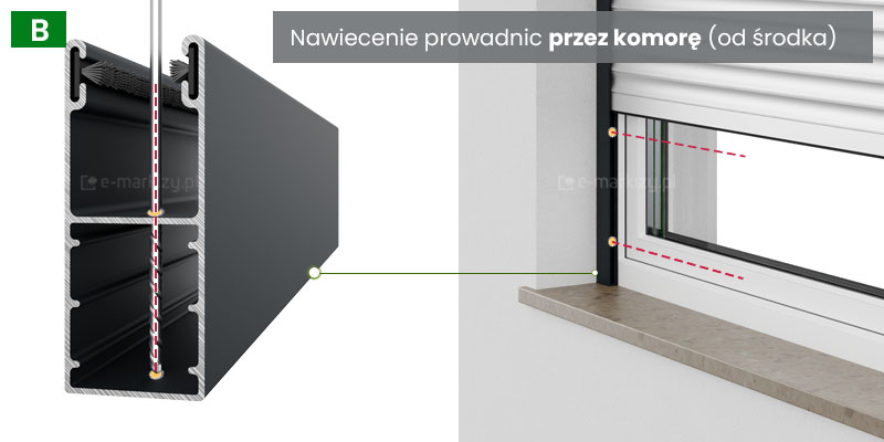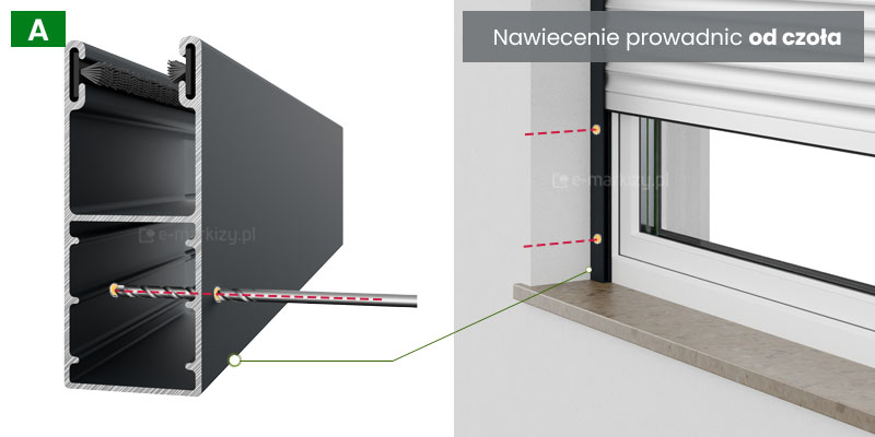 Każda prowadnica może być opcjonalnie nawiercona podczas przygotowania produkcji. Prowadnice rolet wiercone są od strony frontu (od czoła) lub od strony wewnętrznej. Nawiercenia można również wykonać podczas montażu we własnym zakresie, co da nam możliwość indywidualnego podejścia do przykręcenia prowadnic w dowolnym miejscu na oknie lub ścianie.
