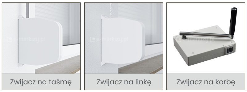 Roletę można wyposażyć w napęd ręczny linkowy lub taśmowy sterowany ręcznie lub korbowo z wewnątrz pomieszczenia.