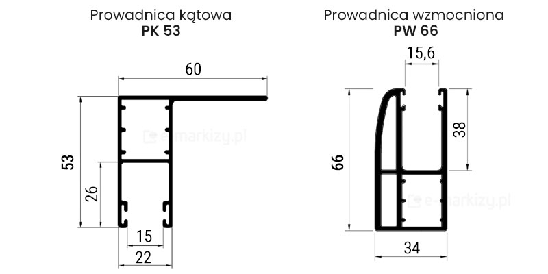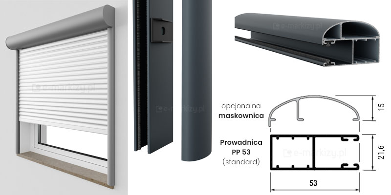 • PP 53/22 (standard): To najczęściej wybierana standardowa prowadnica aluminiowa do rolet o szerokości 22 mm. Może być montowana zarówno na murze, jak i bezpośrednio na ramie okna.