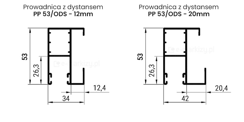 • PP 53/34: Dystansowa prowadnica aluminiowa do rolet, pozwalająca zachować odległość 12 mm od ramy okna, szczególnie użyteczna w przypadku drzwi tarasowych z klamkami.