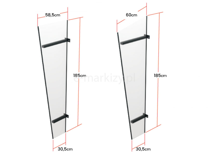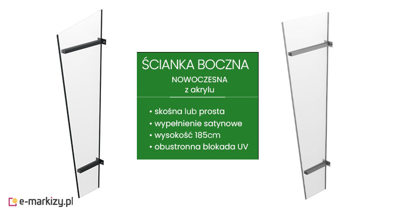 Montaż oferowanych przez nas ścianek bocznych do daszków jest niezwykle prosty. Wystarczy nawiercić w ścianie otwory, w miejscach w których znajdują się uchwyty i dokręcić ściankę do ściany. Każda ścianka posiada instrukcję jej zamontowania dołączoną do produktu.