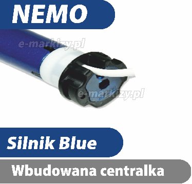 Silnik Nemo Blue o momencie obrotowym 40nm posiada wbudowany odbiornik radiowy i elektroniczne wyłączniki krańcowe, a także elektroniczną kontrolę obrotów silnika. Oznacza to, że markizę obsługujemy bezprzewodowo. W tym celu należy dokupić kompatybilny pilot. Można zastosować również automatykę pogodową z serii BLUE.