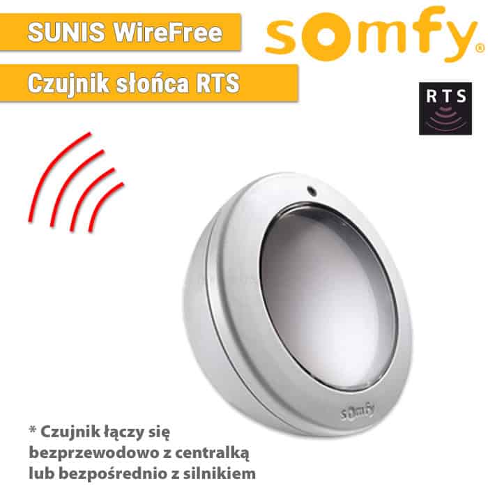 Somfy Sunis WireFree RTS to całkowicie niezależny radiowy czujnik nasłonecznienia, którego zadaniem jest wykrywanie jasności i na podstawie ustawionych wytycznych sterowanie markizami tarasowymi, roletami zewnętrznymi i wewnętrznymi, a także żaluzjami lamelowymi oraz innymi osłonami domowymi i tarasowymi z napędem w technologii RTS.