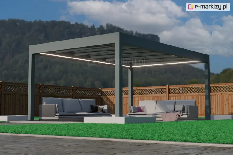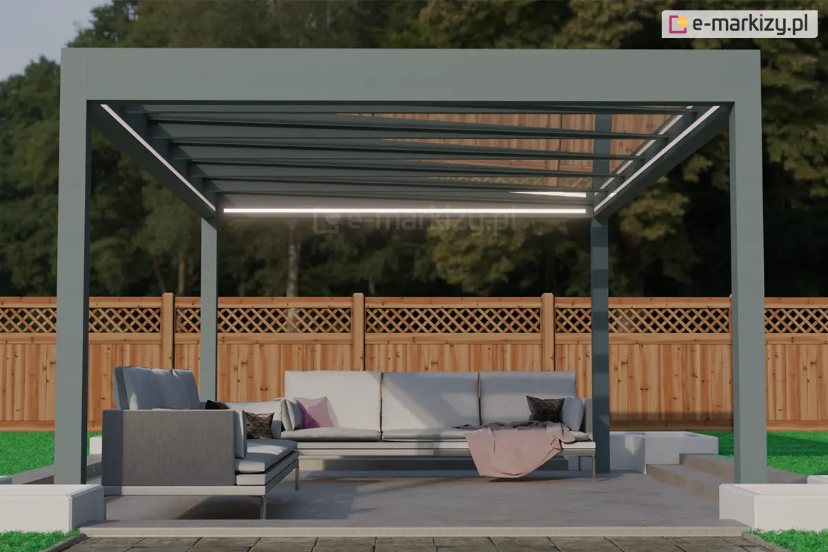 W cenie zadaszenia Spekta Glass otrzymujesz wyjątkowe rozwiązania, które zwiększają komfort jego użytkowania. Wbudowane oświetlenie LED, zintegrowane w postaci taśm na wewnętrznym obwodzie dachu, zapewnia delikatne i nastrojowe światło w barwie ciepłej białej (2700K), które idealnie podkreśla design konstrukcji. To rozwiązanie doskonale sprawdza się podczas wieczornych spotkań na tarasie, tworząc niepowtarzalny klimat. Dodatkowo zintegrowane rynny skutecznie odprowadzają wodę deszczową, dbając o suchą i bezpieczną przestrzeń pod zadaszeniem. Kształt rynien wpisuje się w estetykę projektu, a ich funkcjonalność sprawia, że użytkowanie jest nie tylko wygodne, ale także bezproblemowe.