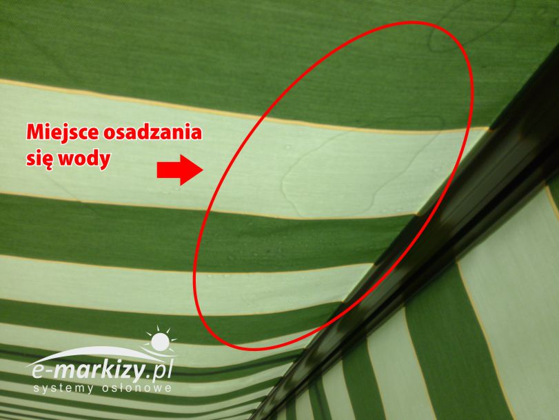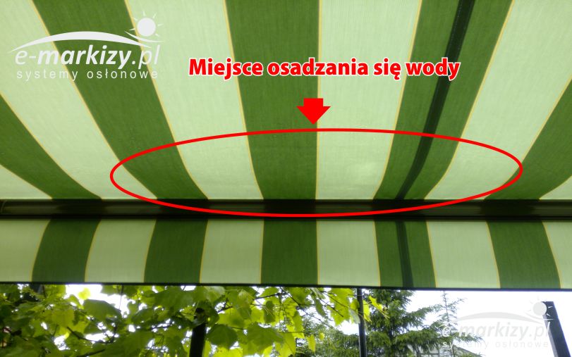 (w skrajnych przypadkach może to doprowadzić do przeciążenia a w następstwie tego to uszkodzenia ramion markizy). Na zdjęciu pokazany jest skrajny przypadek gromadzenia się wody.