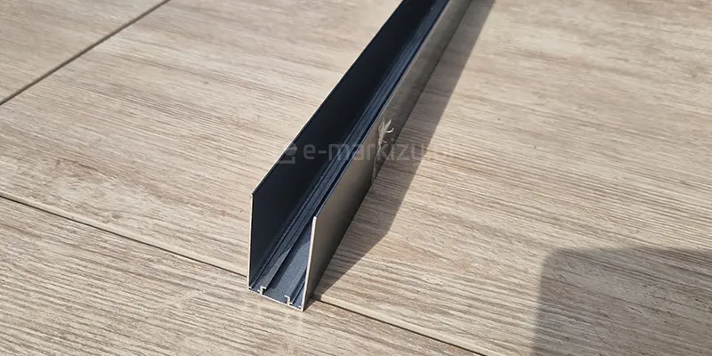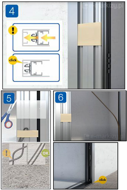 3. Zainstalować prowadnicę dolną na podłożu przy użyciu taśmy dwustronnej podklejonej od spodu. Docisnąć prowadnicę dokładnie w celu dobrego przyklejenia.